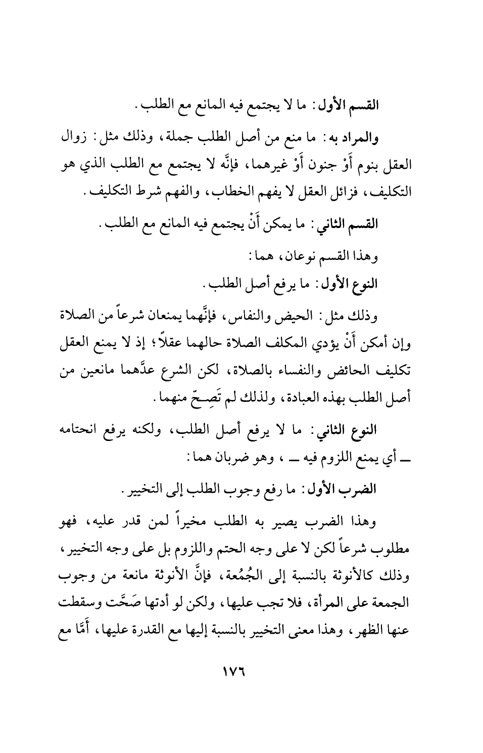 وهذا الضرب يصير به الطلب مخيرًا لمن قدر عليه، فهو مطلوب شرعًا لكن لا على وجه الحتم واللزوم بل على وجه التخيير، وذلك كالأنوثة بالنسبة إلى الجُمُعة، فإنَّ الأنوثة مانعة من وجوب الجمعة على المرأة، فلا تجب عليها، ولكن لو أدتها صَحَّت وسقطت عنها الظهر، وهذا معنى التخيير بالنسبة إليها مع القدرة عليها، أَمَّا مع