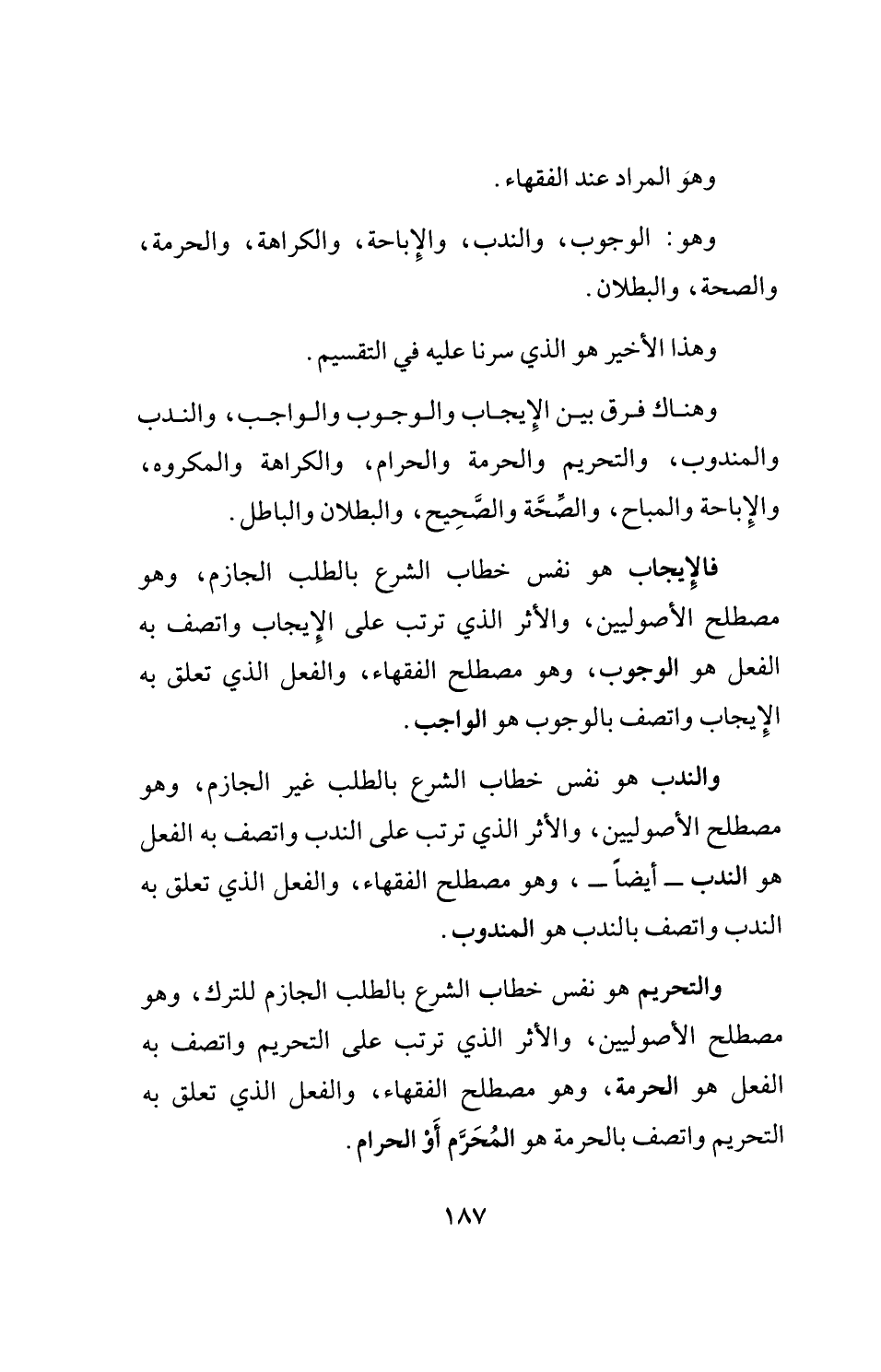 وهناك فرق بين الإِيجاب والوجوب والواجب، والندب والمندوب، والتحريم والحرمة والحرام، والكراهة والمكروه، والإِباحة والمباح، والصِّحَّة والصَّحِيح، والبطلان والباطل.