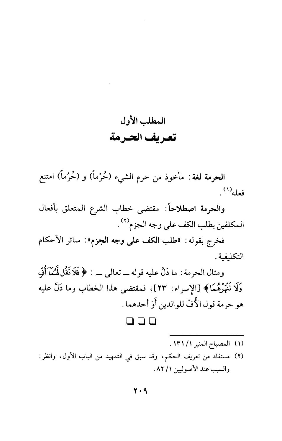 ومثال الحرمة: ما دَلَّ عليه قوله -تعالى-: {فَلَا تَقُلْ لَهُمَا أُفٍّ وَلَا تَنْهَرْهُمَا} [الإِسراء: 23] , فمقتضى هذا الخطاب وما دَلَّ عليه هو حرمة قول الأُفّ للوالدين أَوْ أحدهما.