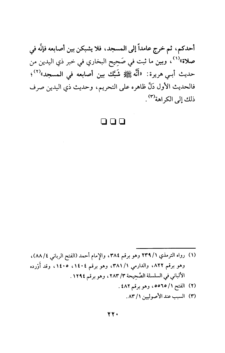 أحدكم، ثم خرج عامدًا إلى المسجد، فلا يشبكن بين أصابعه فإنَّه في صلاة" (¬1)، وبين ما ثبت في صَحِيح البخاري في خبر ذي اليدين من حديث أبي هريرة: "أنّه - صلى الله عليه وسلم - شَبَّك بين أصابعه في المسجد" (¬2)؛ فالحديث الأول دَلَّ ظاهره على التحريم، وحديث ذي اليدين صرف ذلك إلى الكراهة (¬3).