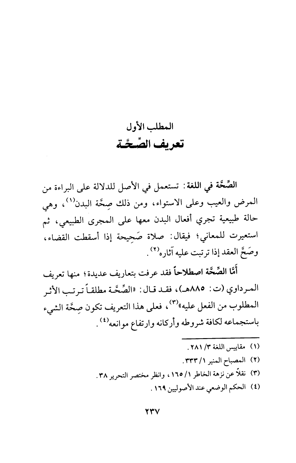 أَمَّا الصِّحَّة اصطلاحًا فقد عرفت بتعاريف عديدة؛ منها تعريف المرداوي (ت: 885 هـ)، فقد قال: "الصِّحَّة مطلقًا ترتب الأثر المطلوب من الفعل عليه" (¬3)، فعلى هذا التعريف تكون صِحَّة الشيء باستجماعه لكافة شروطه وأركانه وارتفاع موانعه (¬4).