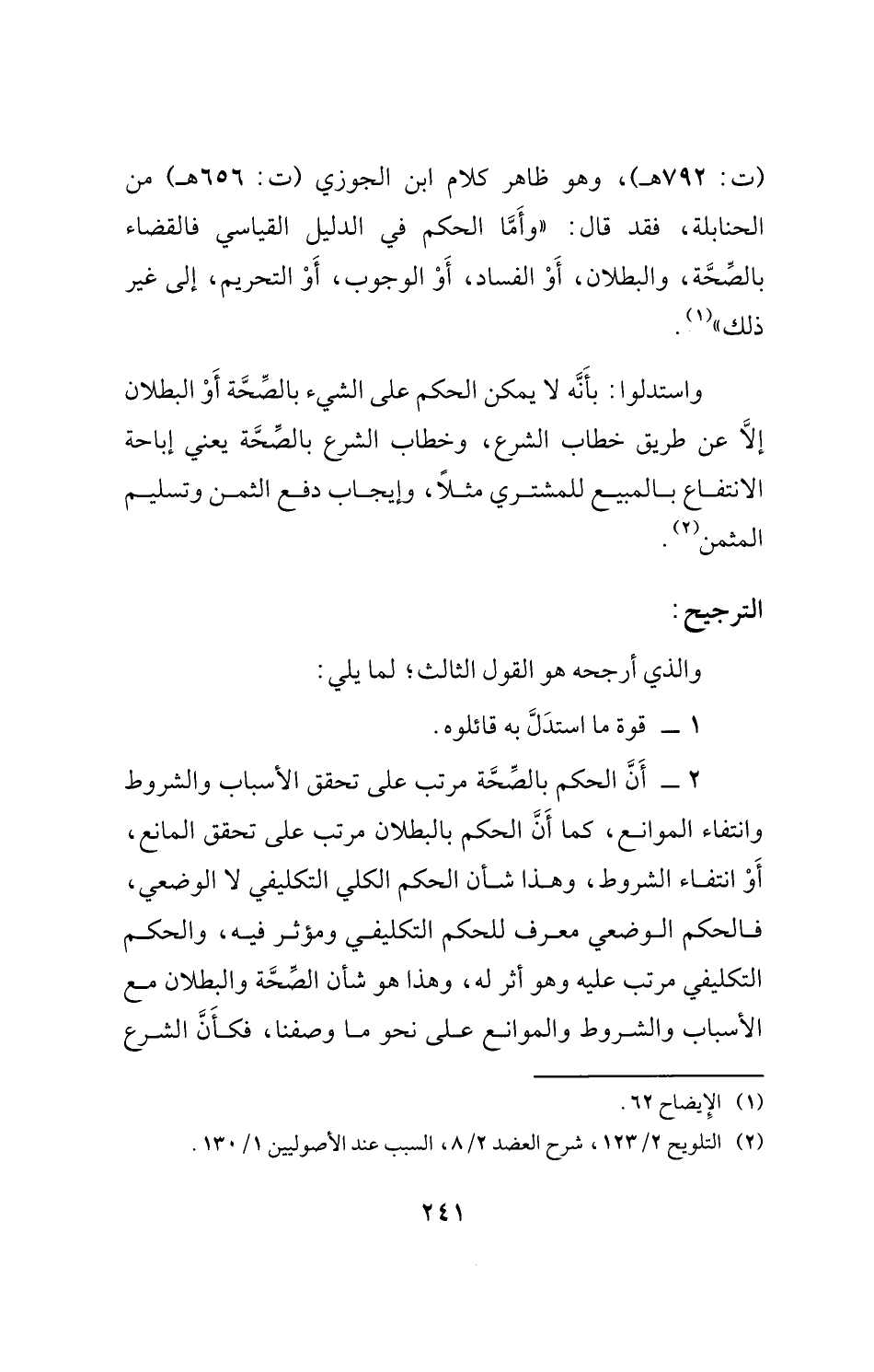 (ت: 792 هـ)، وهو ظاهر كلام ابن الجوزي (ت: 656 هـ) من الحنابلة، فقد قال: "وأَمَّا الحكم في الدليل القياسي فالقضاء بالصِّحَّة، والبطلان، أَوْ الفساد، أَوْ الوجوب، أَوْ التحريم، إلى غير ذلك" (¬1).