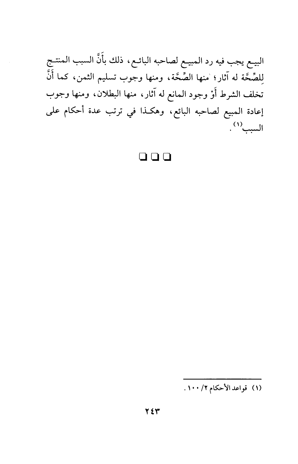 البيع يجب فيه رد المبيع لصاحبه البائع، ذلك بأَنَّ السبب المنتج لِلصِّحَّة له آثار؛ منها الصِّحَّة، ومنها وجوب تسليم الثمن، كما أَنَّ تخلف الشرط أَوْ وجود المانع له آثار، منها البطلان، ومنها وجوب إعادة المبيع لصاحبه البائع، وهكذا في ترتب عدة أحكام على السبب (¬1).
