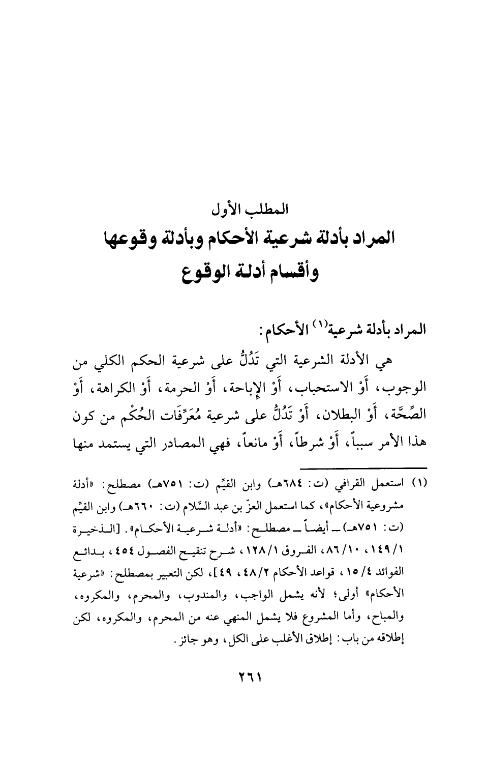 (¬1) استعمل القرافي (ت: 684 هـ) وابن القيِّم (ت: 751 هـ) مصطلح: "أدلة مشروعية الأحكام"، كما استعمل العزّ بن عبد السَّلام (ت: 665 هـ) وابن القيِّم (ت: 751 هـ) - أيضًا - مصطلح: "أدلة شرعية الأحكام". [الذخيرة 1/ 149، 10/ 86، الفروق 1/ 128، شرح تنقيح الفصول 454، بدائع الفوائد 4/ 15، قواعد الأحكام 2/ 48، 49]، لكن التعبير بمصطلح: "شرعية الأحكام" أولى؛ لأنه يشمل الواجب، والمندوب، والمحرم، والمكروه، والمباح، وأما المشروع فلا يشمل المنهي عنه من المحرم، والمكروه، لكن إطلاقه من باب: إطلاق الأغلب على الكل، وهو جائز.