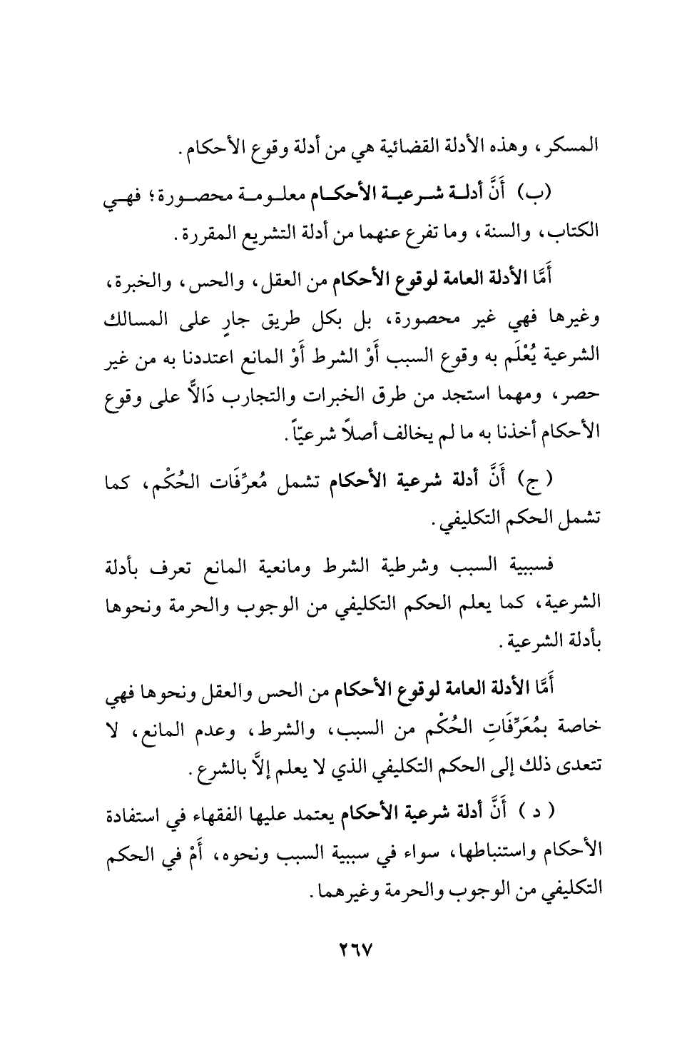 (ب) أَنَّ أدلة شرعية الأحكام معلومة محصورة؛ فهي الكتاب، والسنة، وما تفرع عنهما من أدلة التشريع المقررة.