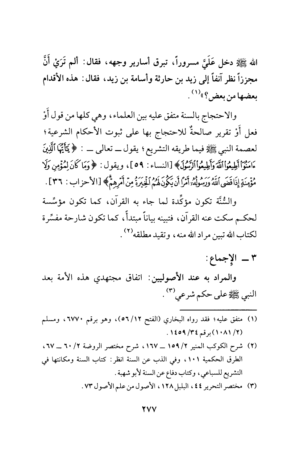 والاحتجاج بالسنة متفق عليه بين العلماء، وهي كلها من قول أَوْ فعل أَوْ تقرير صالحةٌ للاحتجاج بها على ثبوت الأحكام الشرعية؛ لعصمة النبي - صلى الله عليه وسلم - فيما طريقه التشريع؛ يقول- تعالى-: {يَاأَيُّهَا الَّذِينَ آمَنُوا أَطِيعُوا اللَّهَ وَأَطِيعُوا الرَّسُولَ} [النساء: 59]، ويقول: {وَمَا كَانَ لِمُؤْمِنٍ وَلَا مُؤْمِنَةٍ إِذَا قَضَى اللَّهُ وَرَسُولُهُ أَمْرًا أَنْ يَكُونَ لَهُمُ الْخِيَرَةُ مِنْ أَمْرِهِمْ} [الأحزاب: 36].