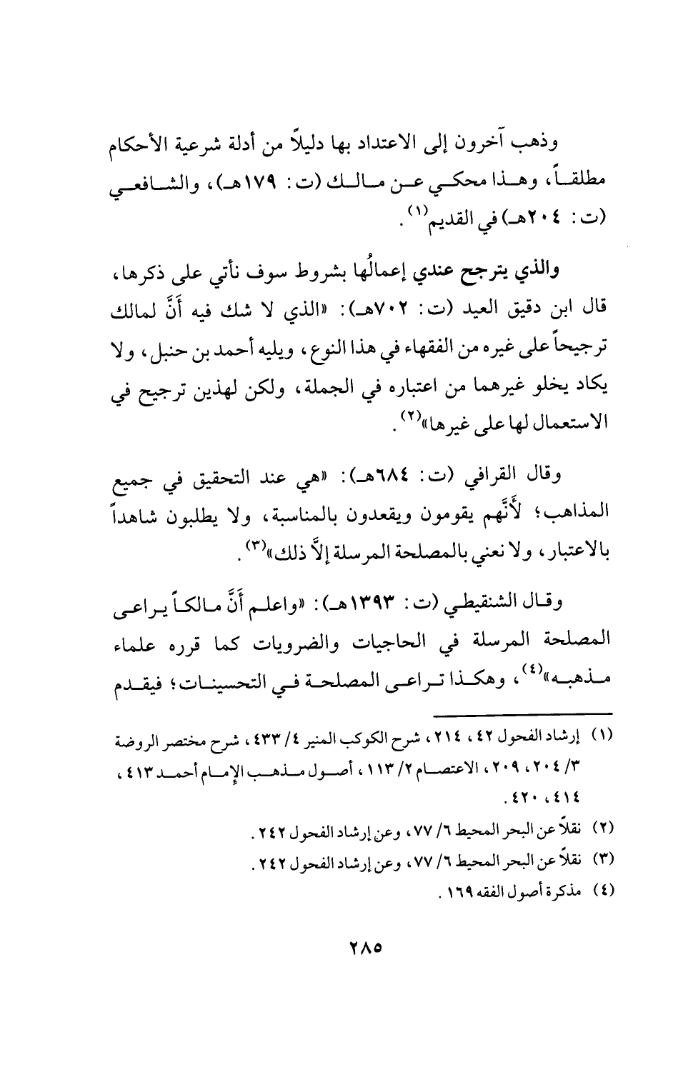 وقال القرافي (ت: 684 هـ): "هي عند التحقيق في جميع المذاهب "لأَنَّهم يقومون ويقعدون بالمناسبة، ولا يطلبون شاهدًا بالاعتبار، ولا نعني بالمصلحة المرسلة إلَّا ذلك" (¬3).