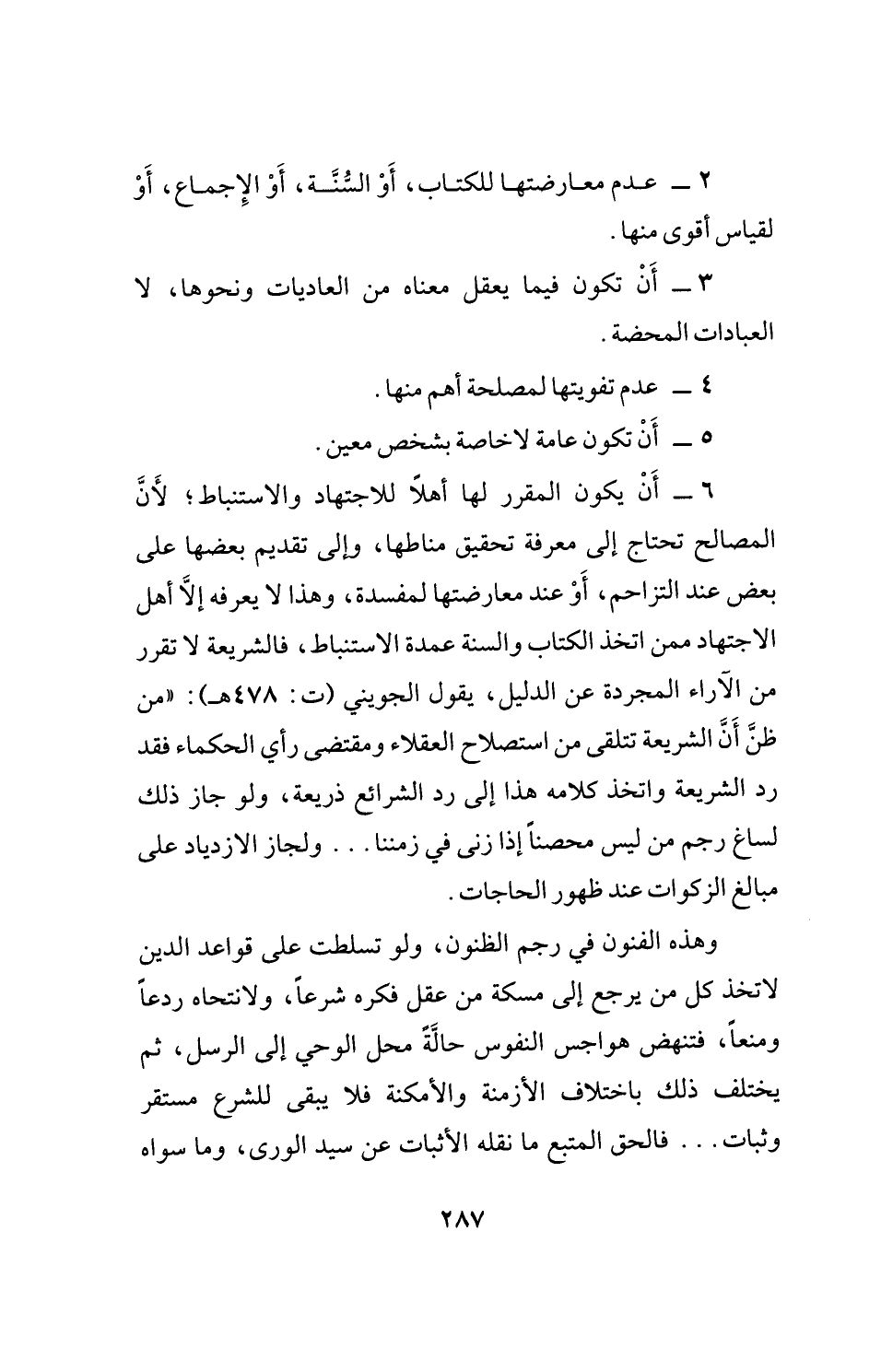 6 - أَنْ يكون المقرر لها أهلًا للاجتهاد والاستنباط؛ لأَنَّ المصالح تحتاج إلى معرفة تحقيق مناطها، وإلى تقديم بعضها على بعض عند التزاحم، أَوْ عند معارضتها لمفسدة، وهذا لا يعرفه إلَّا أهل الاجتهاد ممن اتخذ الكتاب والسنة عمدة الاستنباط، فالشريعة لا تقرر من الآراء المجردة عن الدليل، يقول الجويني (ت: 478 هـ): "من ظنَّ أَنَّ الشريعة تتلقى من استصلاح العقلاء ومقتضى رأي الحكماء فقد رد الشريعة واتخذ كلامه هذا إلى رد الشرائع ذريعة، ولو جاز ذلك لساغ رجم من ليس محصنًا إذا زنى في زمننا ... ولجاز الازدياد على مبالغ الزكوات عند ظهور الحاجات.