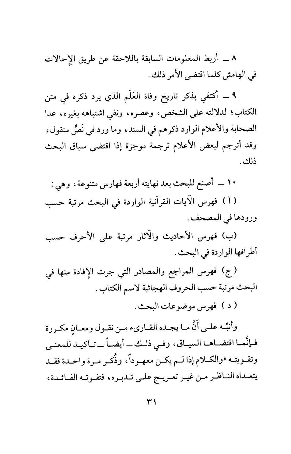 9 - أكتفي بذكر تاريخ وفاة العَلَم الذي يرد ذكره في متن الكتاب؛ لدلالته على الشخص، وعصره، ونفي اشتباهه بغيره، عدا الصحابة والأعلام الوارد ذكرهم في السند، وما ورد في نَصٍّ منقول، وقد أترجم لبعض الأعلام ترجمة موجزة إذا اقتضى سياق البحث ذلك.