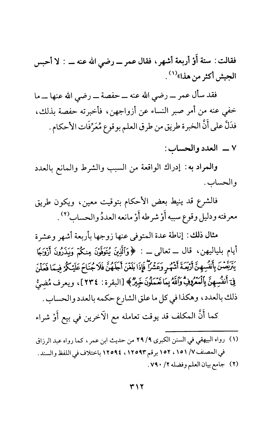 مثال ذلك: إناطة عدة المتوفى عنها زوجها بأربعة أشهر وعشرة أيام بلياليهن، قال- تعالى-: {وَالَّذِينَ يُتَوَفَّوْنَ مِنْكُمْ وَيَذَرُونَ أَزْوَاجًا يَتَرَبَّصْنَ بِأَنْفُسِهِنَّ أَرْبَعَةَ أَشْهُرٍ وَعَشْرًا فَإِذَا بَلَغْنَ أَجَلَهُنَّ فَلَا جُنَاحَ عَلَيْكُمْ فِيمَا فَعَلْنَ فِي أَنْفُسِهِنَّ بِالْمَعْرُوفِ وَاللَّهُ بِمَا تَعْمَلُونَ خَبِيرٌ} [البقرة: 234]، ويعرف مُضِيُّ ذلك بالعدد، وهكذا في كل ما علق الشارع حكمه بالعدد والحساب.