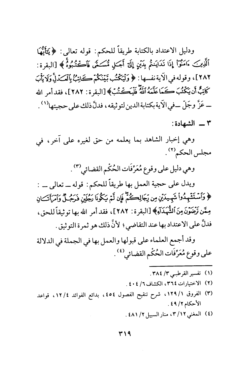 ودليل الاعتداد بالكتابة طريقًا للحكم: قوله تعالى: {يَاأَيُّهَا الَّذِينَ آمَنُوا إِذَا تَدَايَنْتُمْ بِدَيْنٍ إِلَى أَجَلٍ مُسَمًّى فَاكْتُبُوهُ} [البقرة: 282]، وقوله في الآية نفسها: {وَلْيَكْتُبْ بَيْنَكُمْ كَاتِبٌ بِالْعَدْلِ وَلَا يَأْبَ كَاتِبٌ أَنْ يَكْتُبَ كَمَا عَلَّمَهُ اللَّهُ فَلْيَكْتُبْ} [البقرة: 282]، فقد أمر الله - عَزَّ وجَلّ- في الآية بكتابة الدين لتوثيقه، فدلَّ ذلك على حجيتها (¬1).