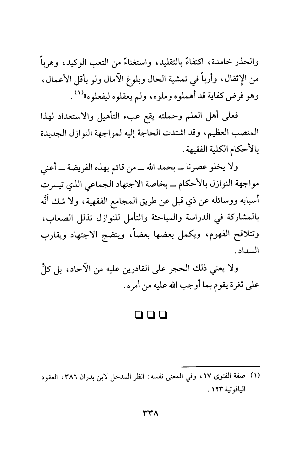 ولا يخلو عصرنا- بحمد الله- من قائم بهذه الفريضة- أعني مواجهة النوازل بالأحكام- بخاصة الاجتهاد الجماعي الذي تيسرت أسبابه ووسائله عن ذي قبل عن طريق المجامع الفقهية، ولا شك أَنّه بالمشاركة في الدراسة والمباحثة والتأمل للنوازل تذلل الصعاب، وتتلاقح الفهوم، ويكمل بعضها بعضًا، وينضج الاجتهاد ويقارب السداد.