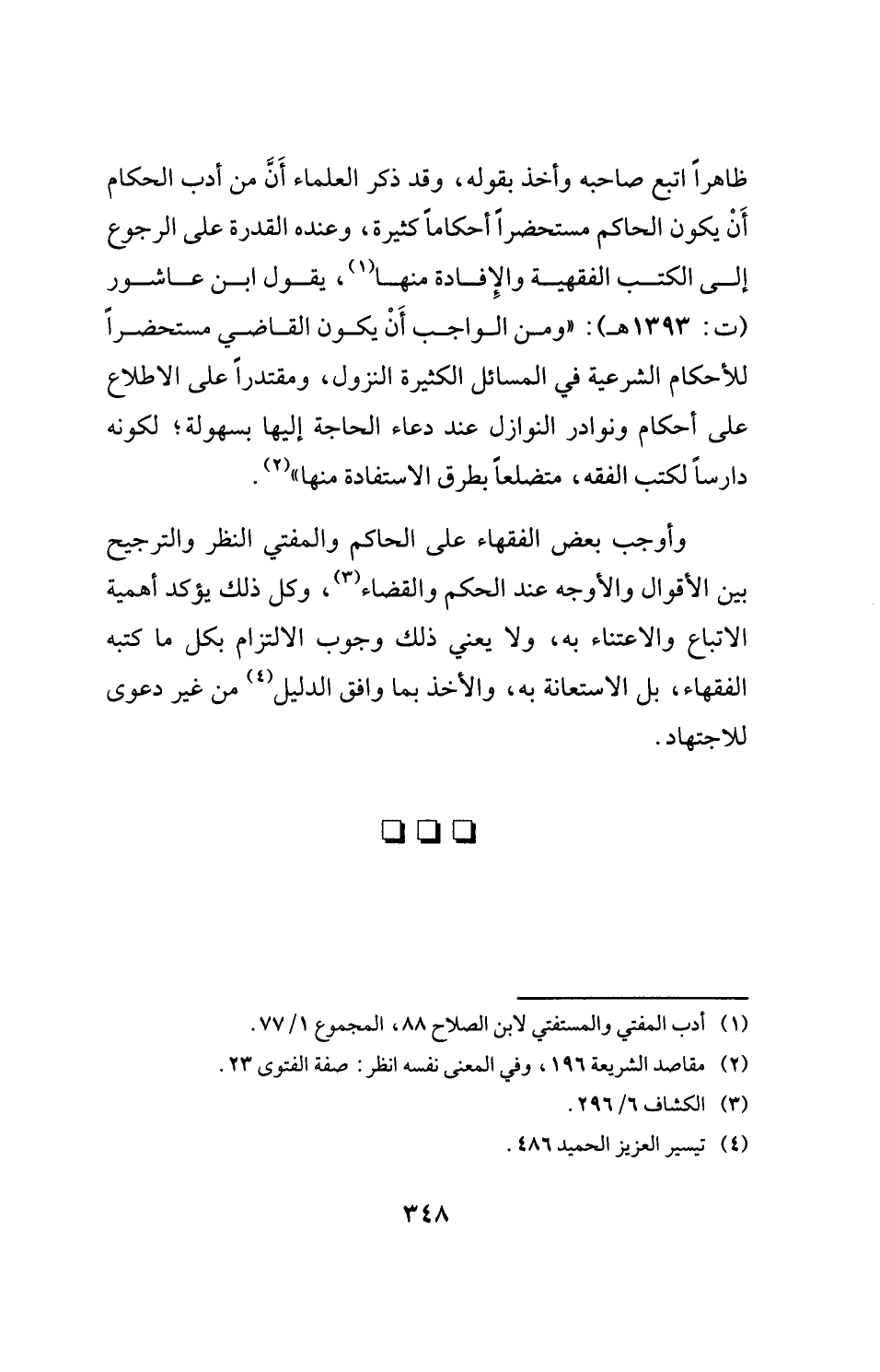 وأوجب بعض الفقهاء على الحاكم والمفتي النظر والترجيح بين الأقوال والأوجه عند الحكم والقضاء (¬3)، وكل ذلك يؤكد أهمية الاتباع والاعتناء به، ولا يعني ذلك وجوب الالتزام بكل ما كتبه الفقهاء، بل الاستعانة به، والأخذ بما وافق الدليل (¬4) من غير دعوى للاجتهاد.