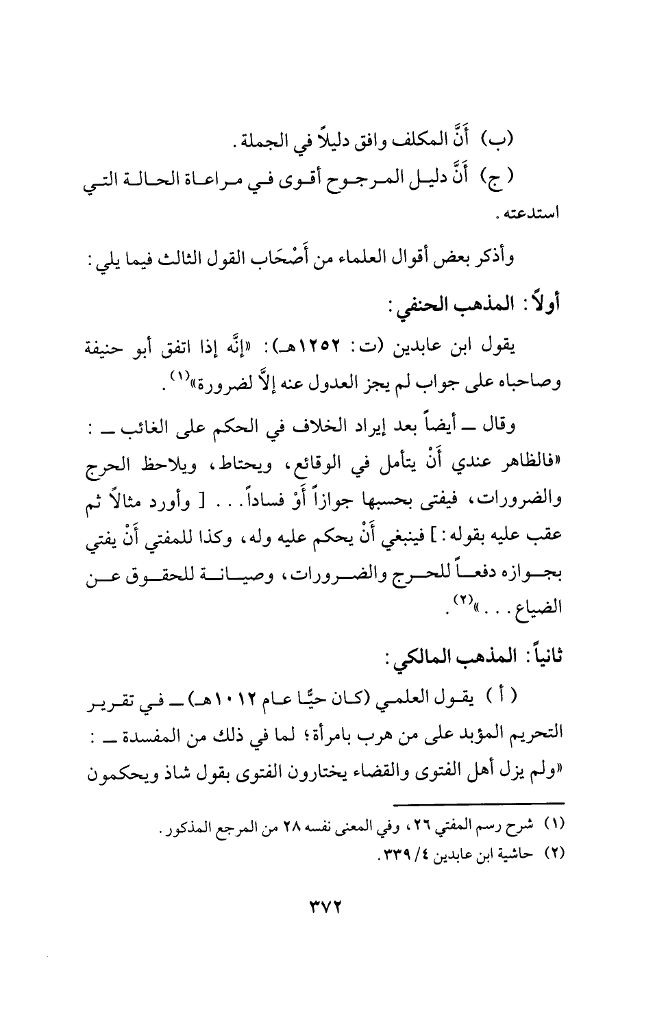 وقال -أيضًا بعد إيراد الخلاف في الحكم على الغائب-: "فالظاهر عندي أَنْ يتأمل في الوقائع، ويحتاط، ويلاحظ الحرج والضرورات، فيفتى بحسبها جوازًا أَوْ فسادًا ... [وأورد مثالًا ثم عقب عليه بقوله: ] فينبغي أَنْ يحكم عليه وله، وكذا للمفتي أَنْ يفتي بجوازه دفعًا للحرج والضرورات، وصيانة للحقوق عن الضياع ... " (¬2).