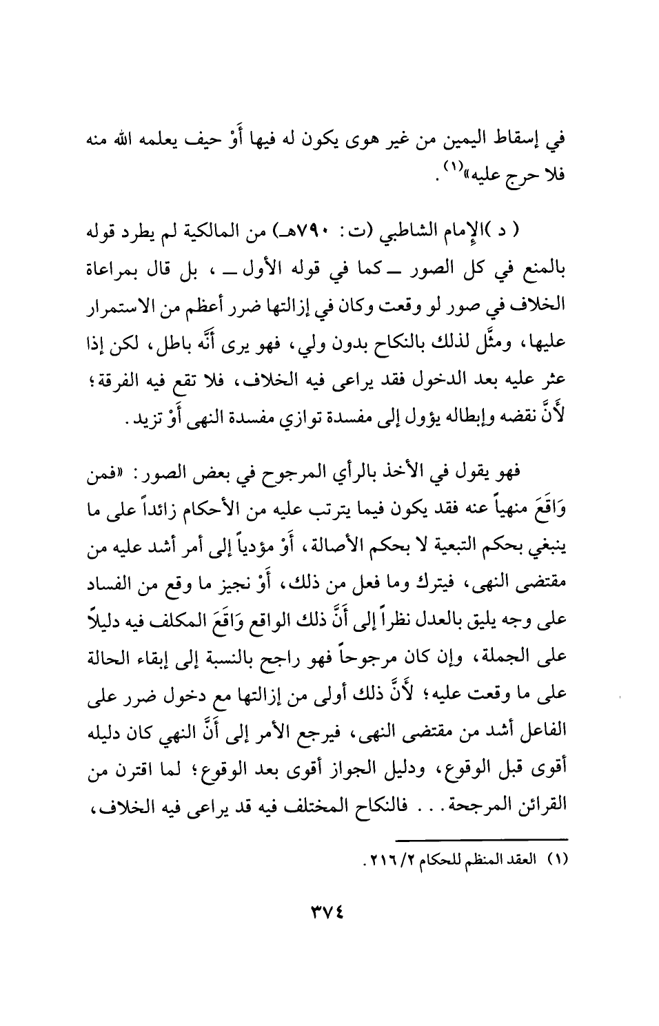 (د) الإِمام الشاطبي (ت: 790 هـ) من المالكية لم يطرد قوله بالمنع في كل الصور -كما في قوله الأول-، بل قال بمراعاة الخلاف في صور لو وقعت وكان في إزالتها ضرر أعظم من الاستمرار عليها، ومثَّل لذلك بالنكاح بدون ولي، فهو يرى أَنّه باطل، لكن إذا عثر عليه بعد الدخول فقد يراعى فيه الخلاف، فلا تقع فيه الفرقة؛ لأَنَّ نقضه وإبطاله يؤول إلى مفسدة توازي مفسدة النهى أَوْ تزيد.
