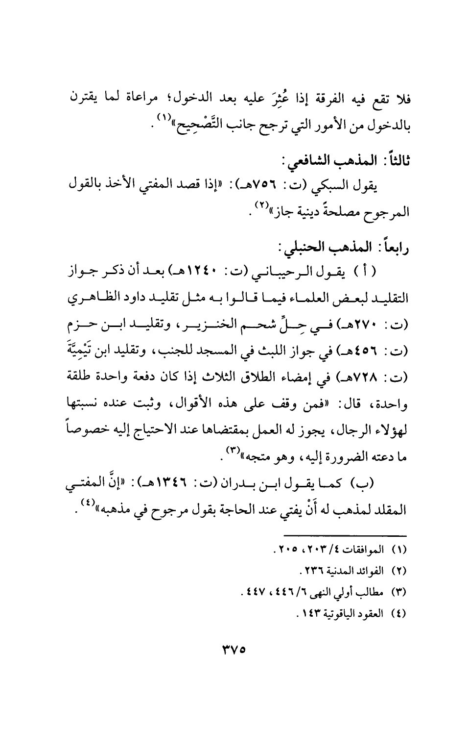 (أ) يقول الرحيباني (ت: 1240 هـ) بعد أن ذكر جواز التقليد لبعض العلماء فيما قالوا به مثل تقليد داود الظاهري (ت: 270 هـ) في حِلِّ شحم الخنزير، وتقليد ابن حزم (ت: 456 هـ) في جواز اللبث في المسجد للجنب، وتقليد ابن تَيْمِيَّةَ (ت: 728 هـ) في إمضاء الطلاق الثلاث إذا كان دفعة واحدة طلقة واحدة، قال: "فمن وقف على هذه الأقوال، وثبت عنده نسبتها لهؤلاء الرجال، يجوز له العمل بمقتضاها عند الاحتياج إليه خصوصًا ما دعته الضرورة إليه، وهو متجه" (¬3).