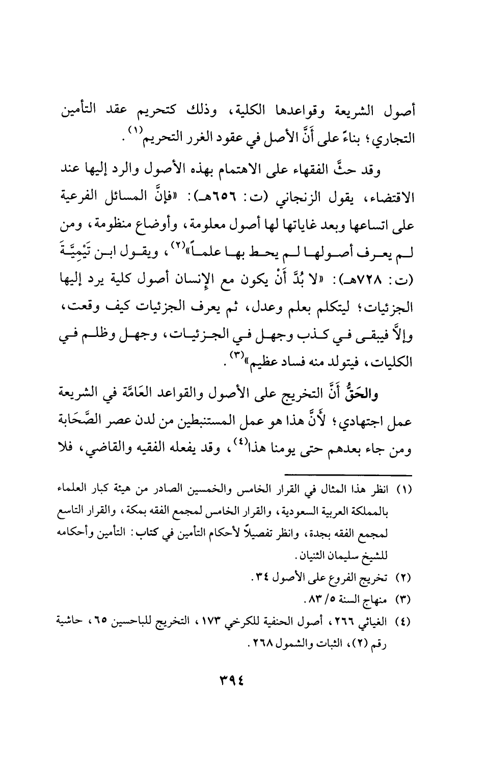 وقد حثَّ الفقهاء على الاهتمام بهذه الأصول والرد إليها عند الاقتضاء، يقول الزنجاني (ت: 656 هـ): "فإنَّ المسائل الفرعية على اتساعها وبعد غاياتها لها أصول معلومة، وأوضاع منظومة، ومن لم يعرف أصولها لم يحط بها علمًا" (¬2)، ويقول ابن تَيْمِيَّةَ (ت: 728 هـ): "لا بُدَّ أَنْ يكون مع الإِنسان أصول كلية يرد إليها الجزئيات؛ ليتكلم بعلم وعدل، ثم يعرف الجزئيات كيف وقعت، وإلَّا فيبقى في كذب وجهل في الجزئيات، وجهل وظلم في الكليات، فيتولد منه فساد عظيم" (¬3).