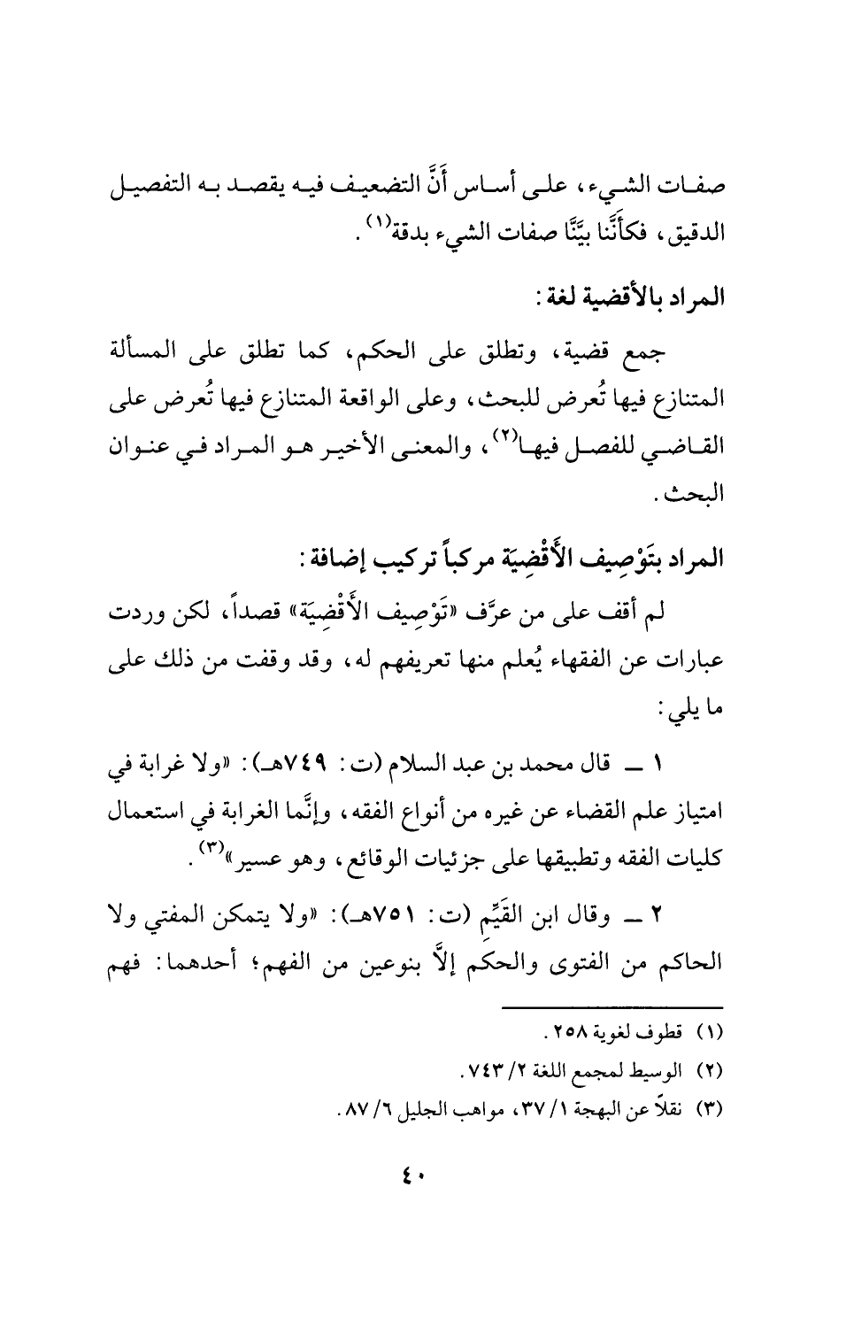 1 - قال محمد بن عبد السلام (ت: 749 هـ): "ولا غرابة في امتياز علم القضاء عن غيره من أنواع الفقه، وإنَّما الغرابة في استعمال كليات الفقه وتطبيقها على جزئيات الوقائع، وهو عسير" (¬3).
