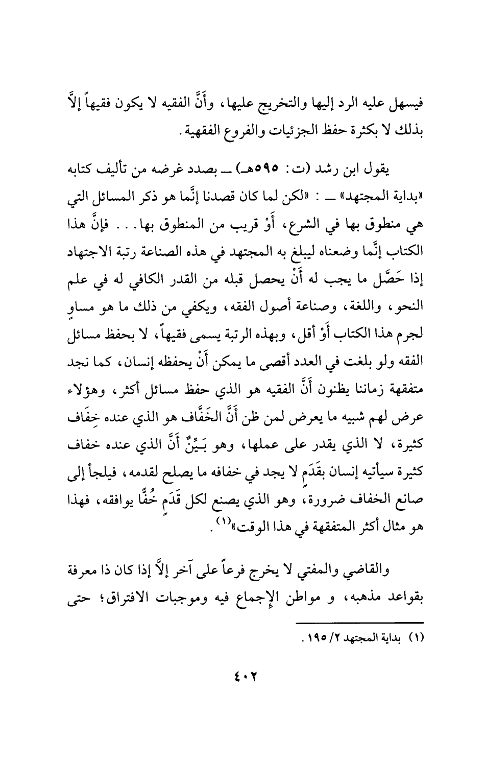يقول ابن رشد (ت: 595 هـ) - بصدد غرضه من تأليف كتابه "بداية المجتهد"-: "لكن لما كان قصدنا إنَّما هو ذكر المسائل التي هي منطوق بها في الشرع، أَوْ قريب من المنطوق بها ... فإنَّ هذا الكتاب إنَّما وضعناه ليبلغ به المجتهد في هذه الصناعة رتبة الاجتهاد إذا حَصَّل ما يجب له أَنْ يحصل قبله من القدر الكافي له في علم النحو، واللغة، وصناعة أصول الفقه، ويكفي من ذلك ما هو مساوٍ لجرم هذا الكتاب أَوْ أقل، وبهذه الرتبة يسمى فقيهًا، لا بحفظ مسائل الفقه ولو بلغت في العدد أقصى ما يمكن أَنْ يحفظه إنسان، كما نجد متفقهة زماننا يظنون أَنَّ الفقيه هو الذي حفظ مسائل أكثر، وهؤلاء عرض لهم شبيه ما يعرض لمن ظن أَنَّ الخَفَّاف هو الَّذي عنده خِفَاف كثيرة، لا الَّذي يقدر على عملها، وهو بَيِّنٌ أَنَّ الَّذي عنده خفاف كثيرة سيأتيه إنسان بقَدَمٍ لا يجد في خفافه ما يصلح لقدمه، فيلجأ إلى صانع الخفاف ضرورة، وهو الَّذي يصنع لكل قَدَمٍ خُفًّا يوافقه، فهذا هو مثال أكثر المتفقهة في هذا الوقت" (¬1).