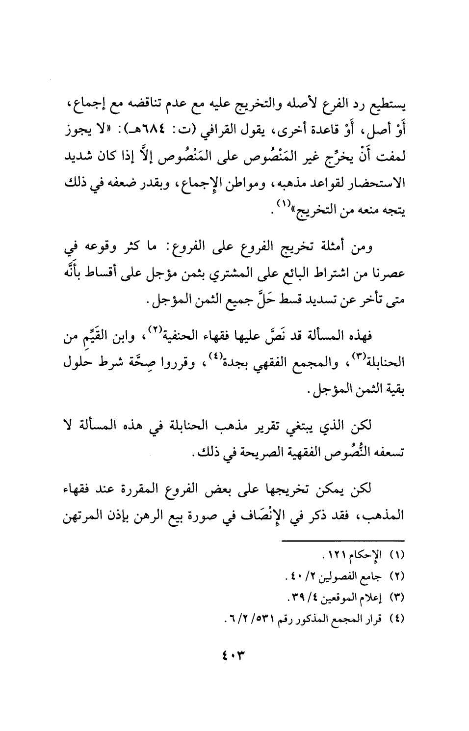 يستطيع رد الفرع لأصله والتخريج عليه مع عدم تناقضه مع إجماع، أَوْ أصل، أَوْ قاعدة أخرى، يقول القرافي (ت: 684 هـ): "لا يجوز لمفت أَنْ يخرِّج غير المَنْصُوص على المَنْصُوص إِلَّا إذا كان شديد الاستحضار لقواعد مذهبه، ومواطن الإِجماع، وبقدر ضعفه في ذلك يتجه منعه من التخريج" (¬1).