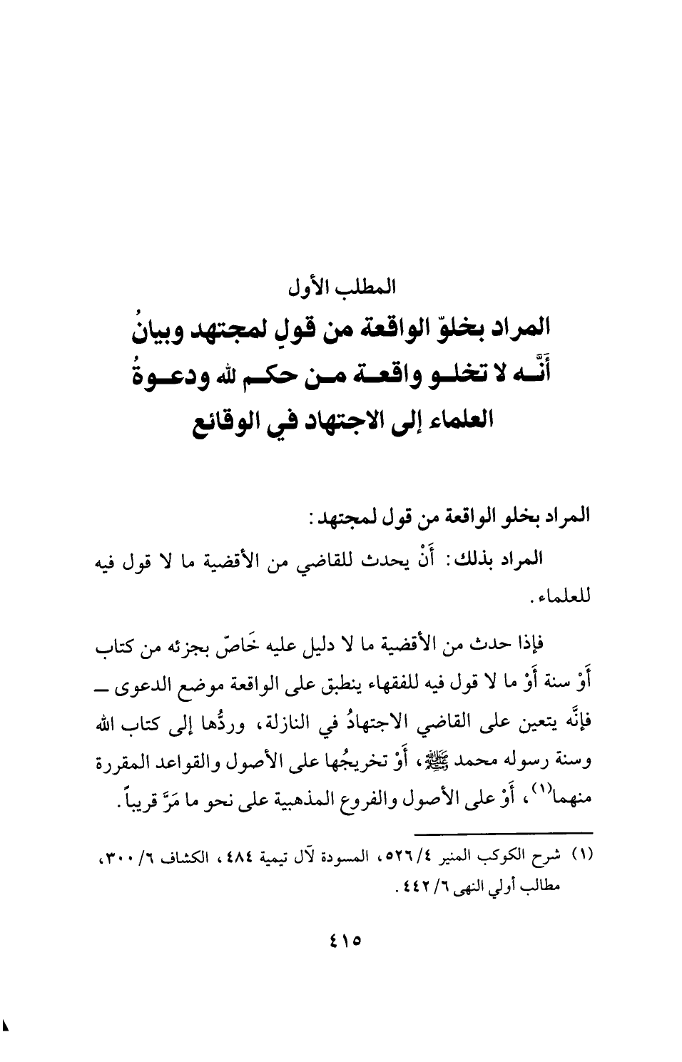 المطلب الأول المراد بخلوّ الواقعة من قولٍ لمجتهد وبيانُ أَنَّه لا تخلو واقعة من حكم لله ودعوةُ العلماء إلى الاجتهاد في الوقائع