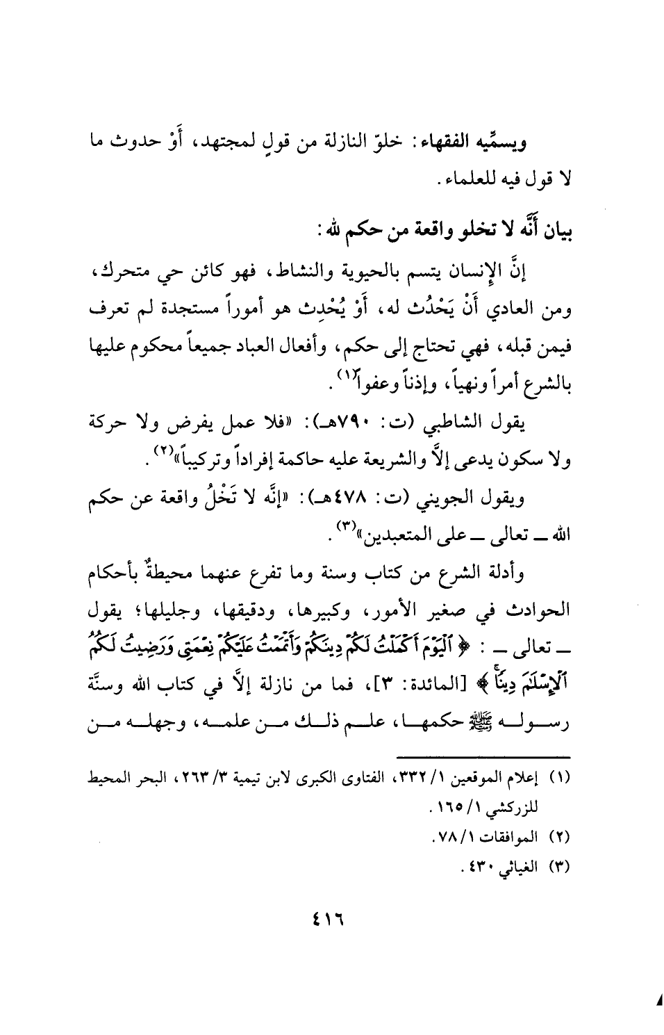 ويقول الجويني (ت: 478 هـ): "إنَّه لا تَخْلُ واقعة عن حكم الله - تعالى - على المتعبدين" (¬3).