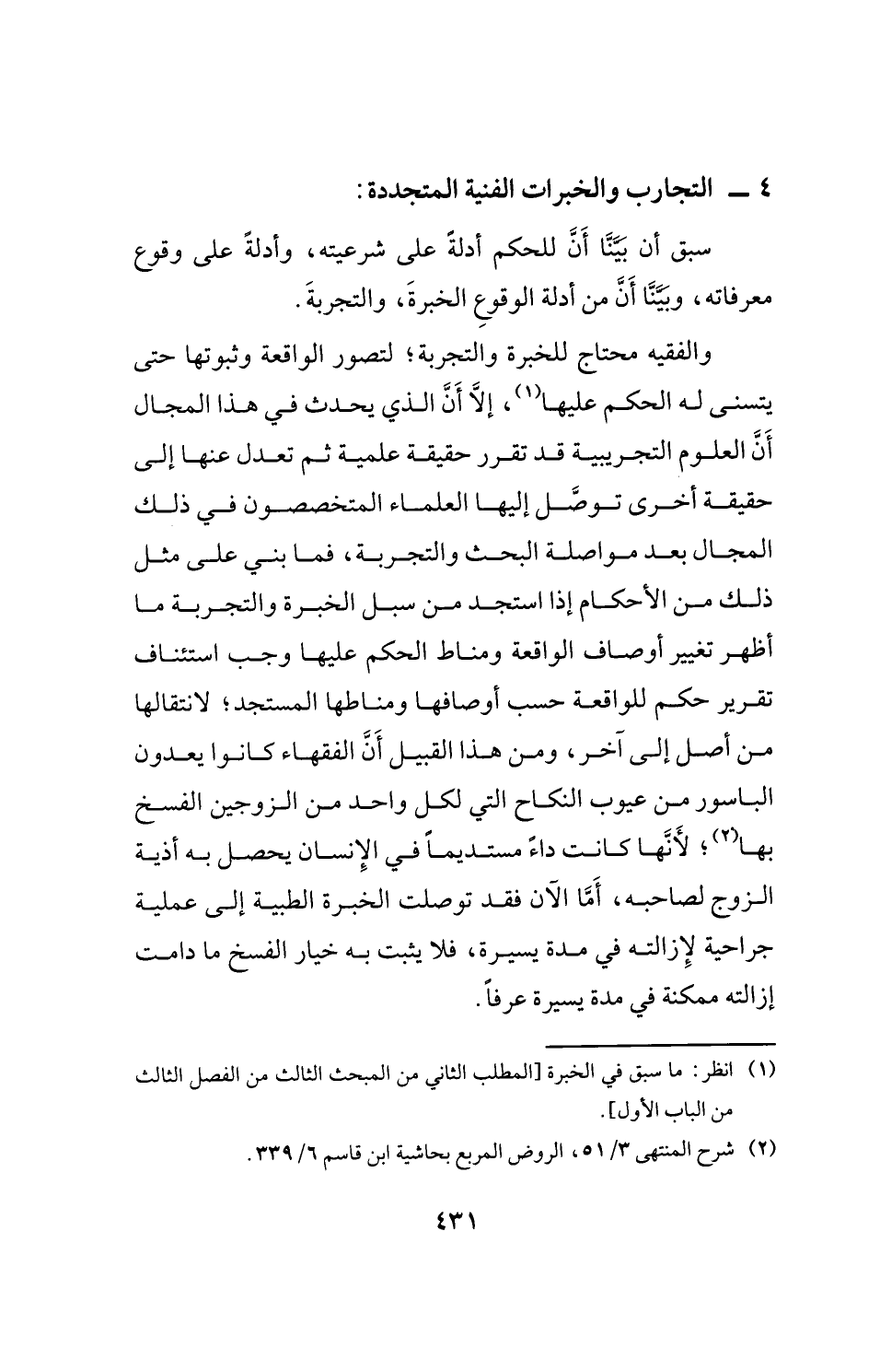 والفقيه محتاج للخبرة والتجربة، لتصور الواقعة وثبوتها حتَّى يتسنى له الحكم عليها (¬1)، إِلَّا أَنَّ الَّذي يحدث في هذا المجال أَن العلوم التجريبية قد تقرر حقيقة علمية ثم تعدل عنها إلى حقيقة أخرى توصَّل إليها العلماء المتخصصون في ذلك المجال بعد مواصلة البحث والتجربة، فما بني على مثل ذلك من الأحكام إذا استجد من سبل الخبرة والتجربة ما أظهر تغيير أوصاف الواقعة ومناط الحكم عليها وجب استئناف تقرير حكم للواقعة حسب أوصافها ومناطها المستجد؛ لانتقالها من أصل إلى آخر، ومن هذا القبيل أَنَّ الفقهاء كانوا يعدون الباسور من عيوب النِّكَاح التي لكل واحد من الزوجين الفسخ بها (¬2)؛ لأَنَّها كانت داءً مستديمًا في الإِنسان يحصل به أذية الزوج لصاحبه، أَمَّا الآن فقد توصلت الخبرة الطبية إلى عملية جراحية لإِزالته في مدة يسيرة، فلا يثبت به خيار الفسخ ما دامت إزالته ممكنة في مدة يسيرة عرفًا.