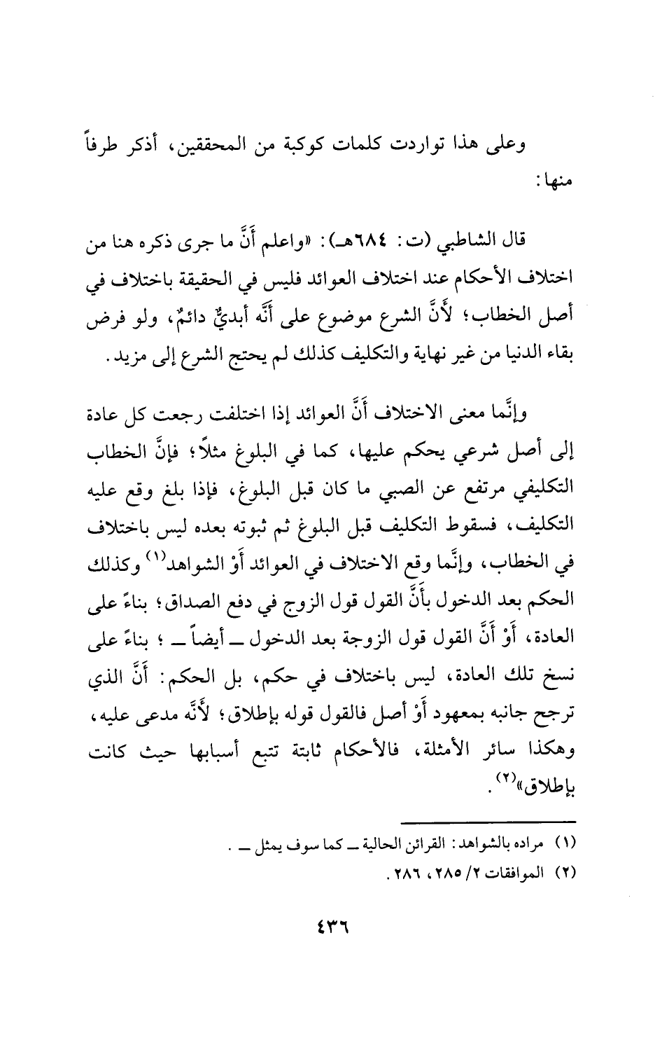 وإنَّما معنى الاختلاف أَنَّ العوائد إذا اختلفت رجعت كل عادة إلى أصل شرعي يحكم عليها، كما في البلوغ مثلًا؛ فإنَّ الخطاب التكليفي مرتفع عن الصبي ما كان قبل البلوغ، فإذا بلغ وقع عليه التكليف، فسقوط التكليف قبل البلوغ ثم ثبوته بعده ليس باختلاف في الخطاب، وإنَّما وقع الاختلاف في العوائد أَوْ الشواهد (¬1) وكذلك الحكم بعد الدخول بأَنَّ القول قول الزوج في دفع الصداق؛ بناءً على العادة، أَوْ أَنَّ القول قول الزوجة بعد الدخول - أيضًا -؛ بناءً على نسخ تلك العادة، ليس باختلاف في حكم، بل الحكم: أَنَّ الَّذي ترجح جانبه بمعهود أَوْ أصل فالقول قوله بإطلاق؛ لأَنَّه مدعى عليه، وهكذا سائر الأمثلة، فالأحكام ثابتة تتبع أسبابها حيث كانت بإطلاق" (¬2).