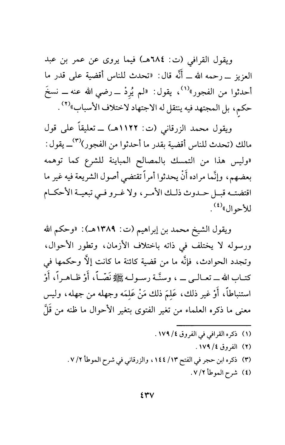 ويقول القرافي (ت: 684 هـ) فيما يروى عن عمر بن عبد العزيز - رحمه الله - أنَّه قال: "تحدث للناس أقضية على قدر ما أحدثوا من الفجور" (¬1)، يقول: "لم يُرِدْ - رضي الله عنه - نسخَ حكمٍ، بل المجتهد فيه ينتقل له الاجتهاد لاختلاف الأسباب" (¬2).