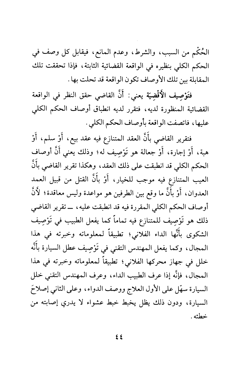 فتقرير القاضي بأَنَّ العقد المتنازع فيه عقد بيع، أَوْ سلم، أَوْ هبة، أَوْ إجارة، أَوْ جعالة هو تَوْصِيف له؛ وذلك يعني أَنَّ أوصاف الحكم الكلي قد انطبقت على ذلك العقد، وهكذا تقرير القاضي بأَنَّ العيب المتنازع فيه موجب للخيار، أَوْ بأَنَّ القتل من قبيل العمد العدوان، أَوْ بأنَّ ما وقع بين الطرفين هو مواعدة وليس معاقدة؛ لأَنَّ أوصاف الحكم الكلي المقررة فيه قد انطبقت عليه، - تقرير القاضي ذلك هو تَوْصِيف للمتنازع فيه تمامًا كما يفعل الطبيب في تَوْصِيف الشكوى بأَنَّها الداء الفلاني؛ تطبيقًا لمعلوماته وخبرته في هذا المجال، وكما يفعل المهندس التقني في تَوْصِيف عطل السيارة بأَنَّه خلل في جهاز محركها الفلاني؛ تطبيقًا لمعلوماته وخبرته في هذا المجال، فإنَّه إذا عرف الطبيب الداء، وعرف المهندس التقني خلل السيارة سهّل على الأول العلاج ووصف الدواء، وعلى الثاني إصلاحَ السيارة، ودون ذلك يظل يخبط خبط عشواء لا يدري إصابته من خطئه.