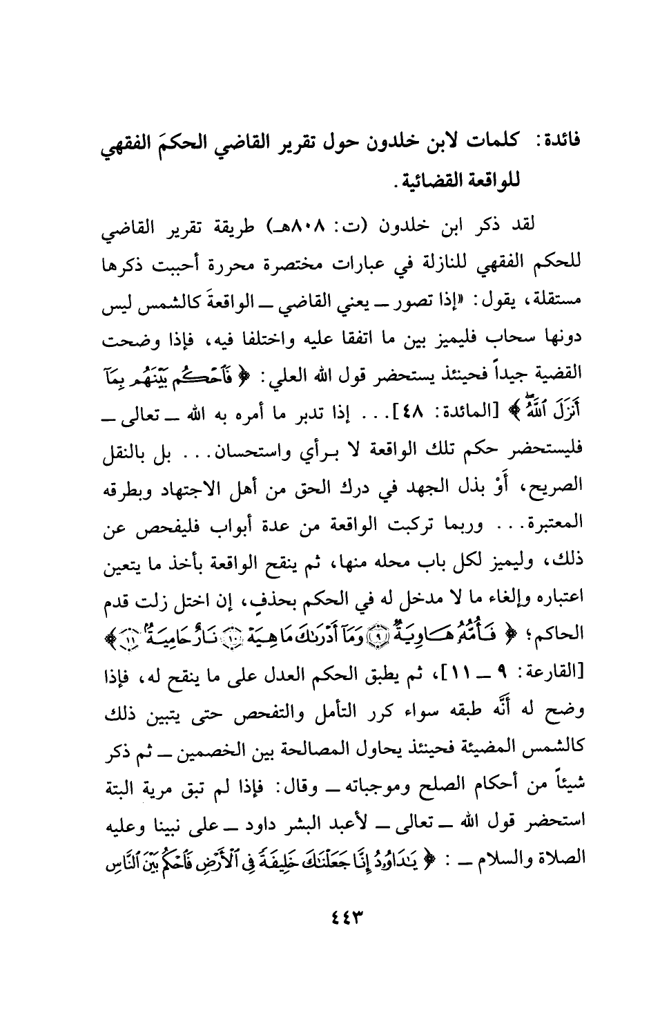 فائدة: كلمات لابن خلدون حول تقرير القاضي الحكمَ الفقهي للواقعة القضائية.