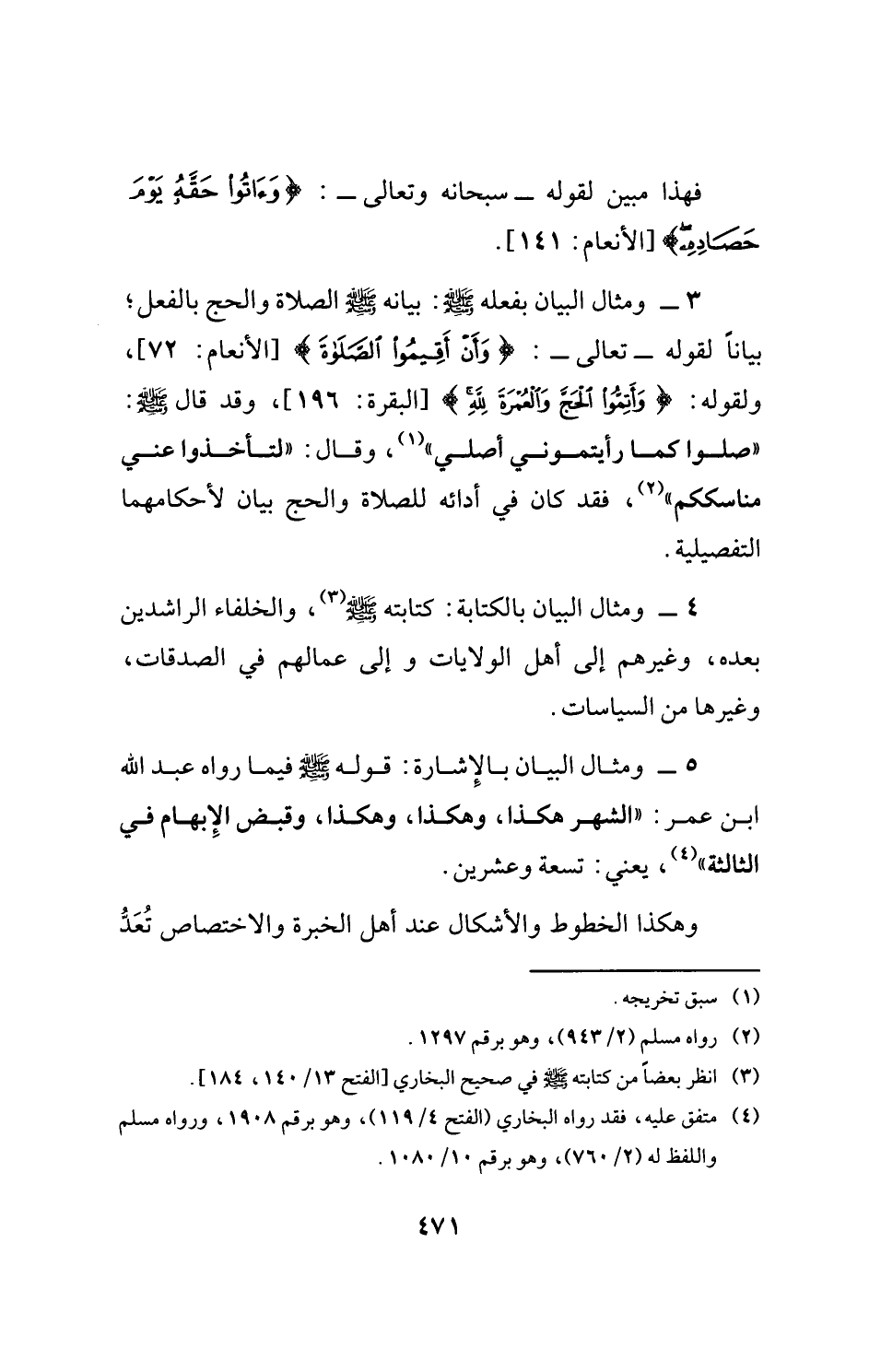 3 - ومثال البيان بفعله - صلى الله عليه وسلم -: بيانه - صلى الله عليه وسلم - الصلاة والحج بالفعل؛ بيانًا لقوله- تعالى-: {وَأَنْ أَقِيمُوا الصَّلَاةَ} [الأنعام: 72]، ولقوله: {وَأَتِمُّوا الْحَجَّ وَالْعُمْرَةَ لِلَّهِ} [البقرة: 196]، وقد قال - صلى الله عليه وسلم -: "صلوا كما رأيتموني أصلي" (¬1)، وقال: "لتأخذوا عني مناسككم" (¬2)، فقد كان في أدائه للصلاة والحج بيان لأحكامهما التفصيلية.