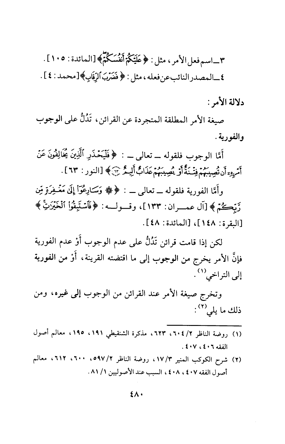 وأَمَّا الفورية فلقوله- تعالى-: {وَسَارِعُوا إِلَى مَغْفِرَةٍ مِنْ رَبِّكُمْ} [آل عمران: 133]، وقوله: {فَاسْتَبِقُوا الْخَيْرَاتِ} [البقرة: 148]، [المائدة: 48].