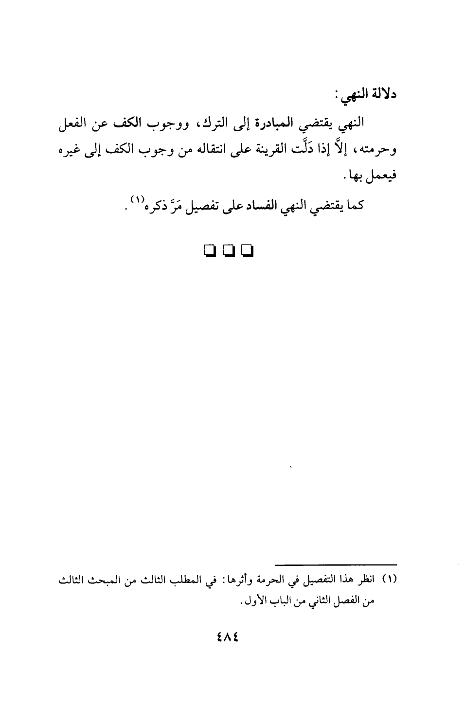النهي يقتضي المبادرة إلى الترك، ووجوب الكف عن الفعل وحرمته، إلَّا إذا دَلَّت القرينة على انتقاله من وجوب الكف إلى غيره فيعمل بها.