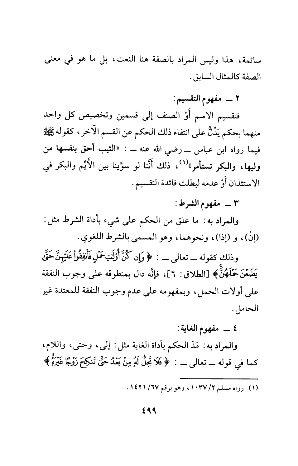 فتقسيم الاسم أَوْ الصنف إلى قسمين وتخصيص كل واحد منهما بحكم يَدُلُّ على انتفاء ذلك الحكم عن القسم الآخر، كقوله - صلى الله عليه وسلم - فيما رواه ابن عباس- رضي الله عنه-: "الثيب أحق بنفسها من وليها، والبكر تستأمر" (¬1)، ذلك أَنّنا لو سوَّينا بين الأيِّم والبكر في الاستئذان أَوْ عدمه لبطلت فائدة التقسيم.