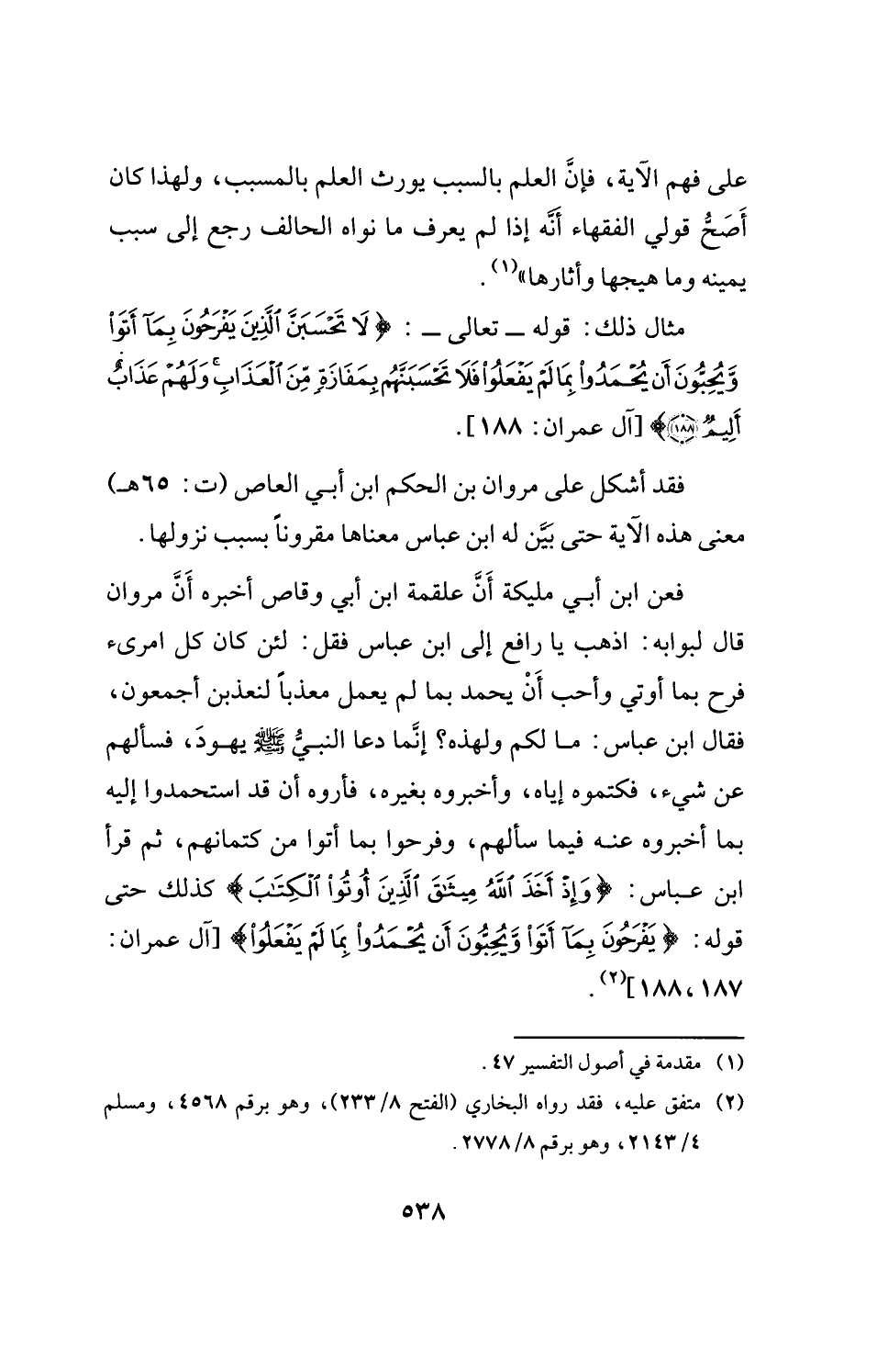 فعن ابن أبي مليكة أَنَّ علقمة ابن أبي وقاص أخبره أَنَّ مروان قال لبوابه: اذهب يا رافع إلى ابن عباس فقل: لئن كان كل امرئ فرح بما أوتي وأحب أَنْ يحمد بما لم يعمل معذبًا لنعذبن أجمعون، فقال ابن عباس: ما لكم ولهذه؟ إنَّما دعا النبيُّ - صلى الله عليه وسلم - يهودَ، فسألهم عن شيء، فكتموه إياه، وأخبروه بغيره، فأروه أن قد استحمدوا إليه بما أخبروه عنه فيما سألهم، وفرحوا بما أتوا من كتمانهم، ثم قرأ ابن عباس: {وَإِذْ أَخَذَ اللَّهُ مِيثَاقَ الَّذِينَ أُوتُوا الْكِتَابَ} كذلك حتى قوله: {يَفْرَحُونَ بِمَا أَتَوْا وَيُحِبُّونَ أَنْ يُحْمَدُوا بِمَا لَمْ يَفْعَلُوا} [آل عمران: 188، 187] (¬2).