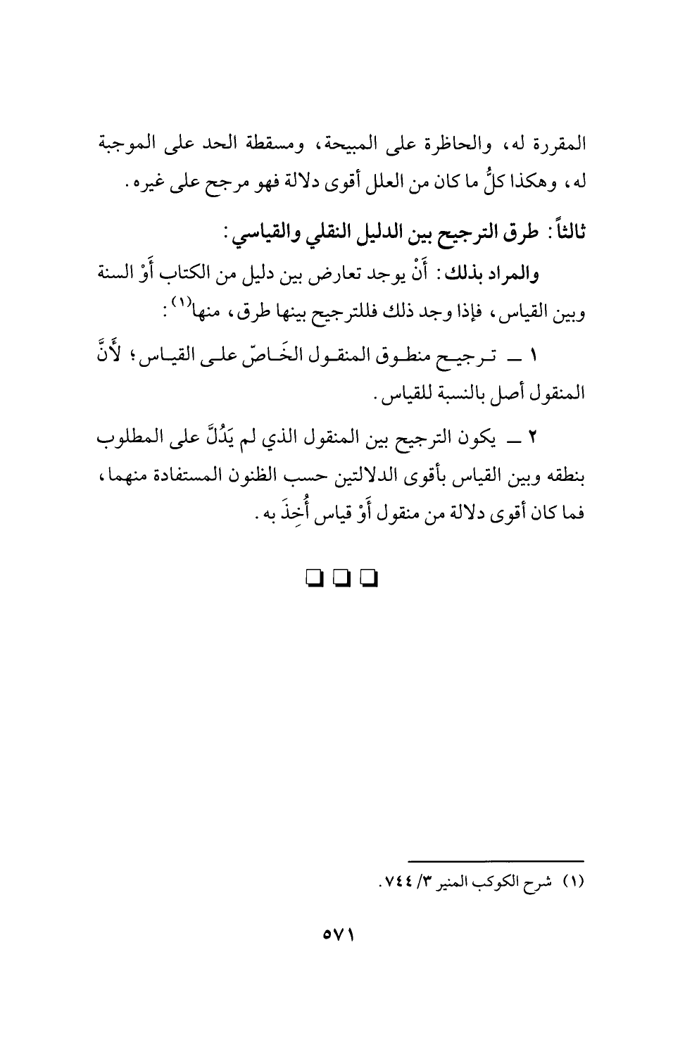 2 - يكون الترجيح بين المنقول الذي لم يَدُلَّ على المطلوب بنطقه وبين القياس بأقوى الدلالتين حسب الظنون المستفادة منهما، فما كان أقوى دلالة من منقول أَوْ قياس أُخِذَ به.