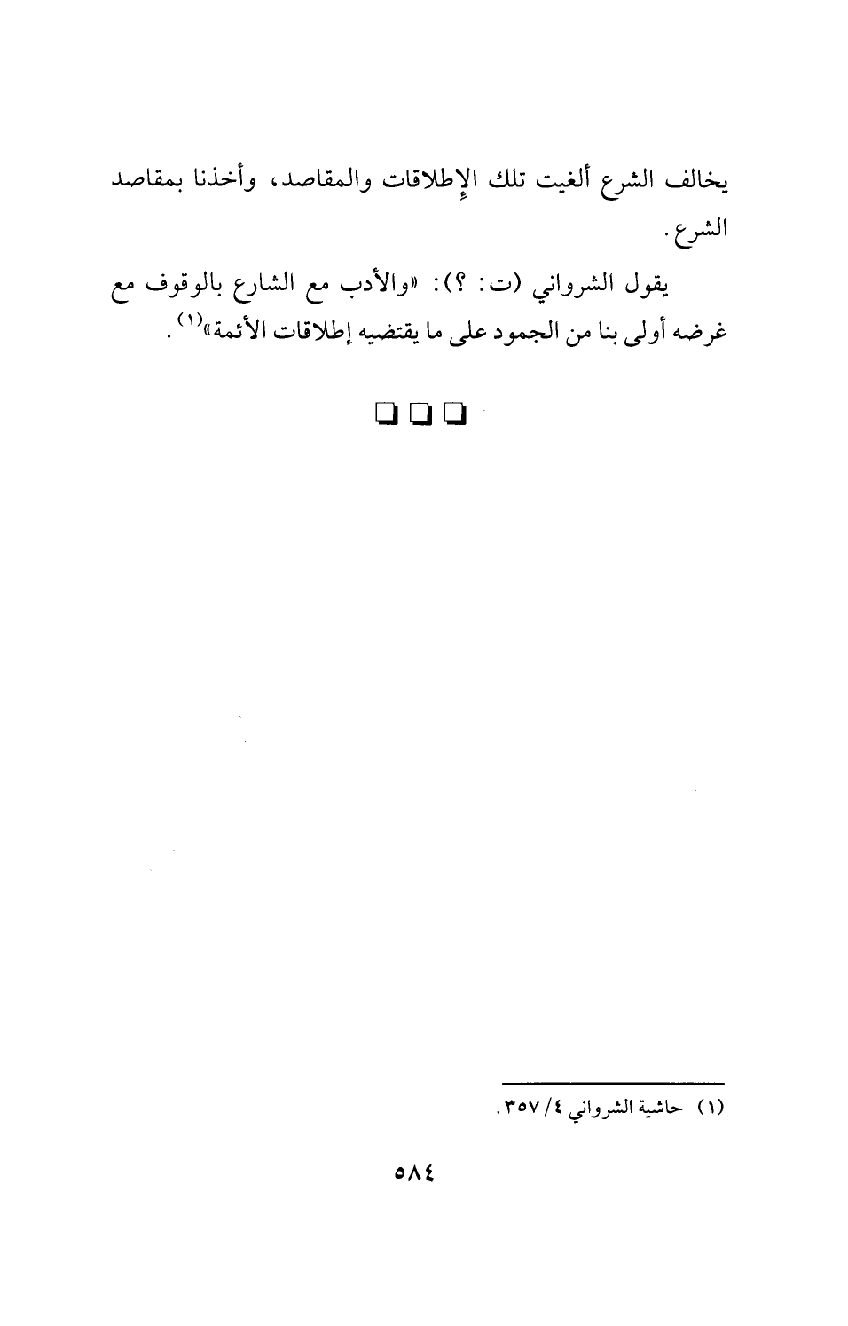 يقول الشرواني (ت: ؟ ): "والأدب مع الشارع بالوقوف مع غرضه أولى بنا من الجمود على ما يقتضيه إطلاقات الأئمة" (¬1).
