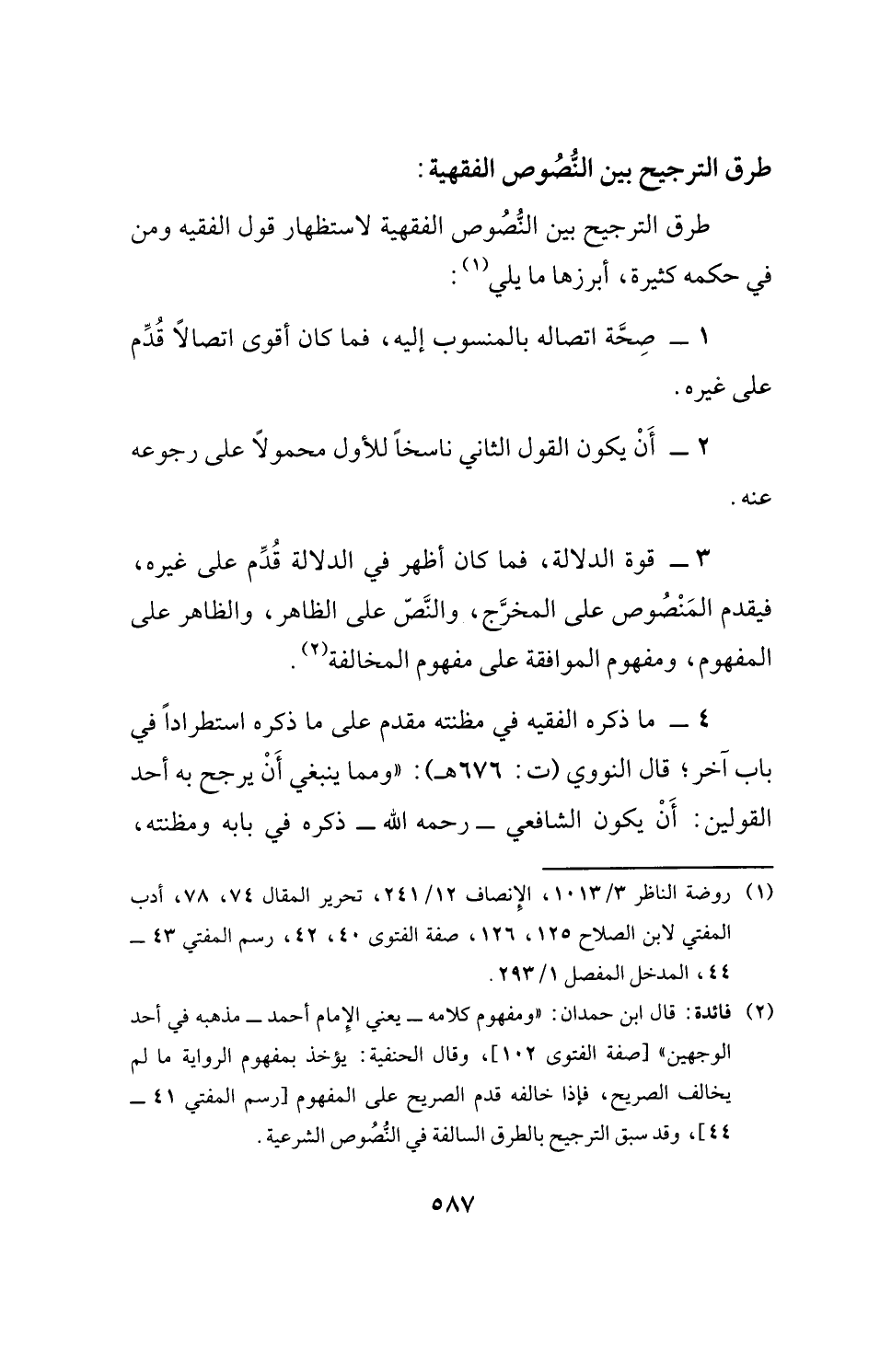 (¬2) فائدة: قال ابن حمدان: "ومفهوم كلامه- يعني الإِمام أحمد- مذهبه في أحد الوجهين" [صفة الفتوى 102]، وقال الحنفية: يؤخذ بمفهوم الرواية ما لم يخالف الصريح، فإذا خالفه قدم الصريح على المفهوم [رسم المفتي 41 - 44]، وقد سبق الترجيح بالطرق السالفة في النُّصُوص الشرعية.