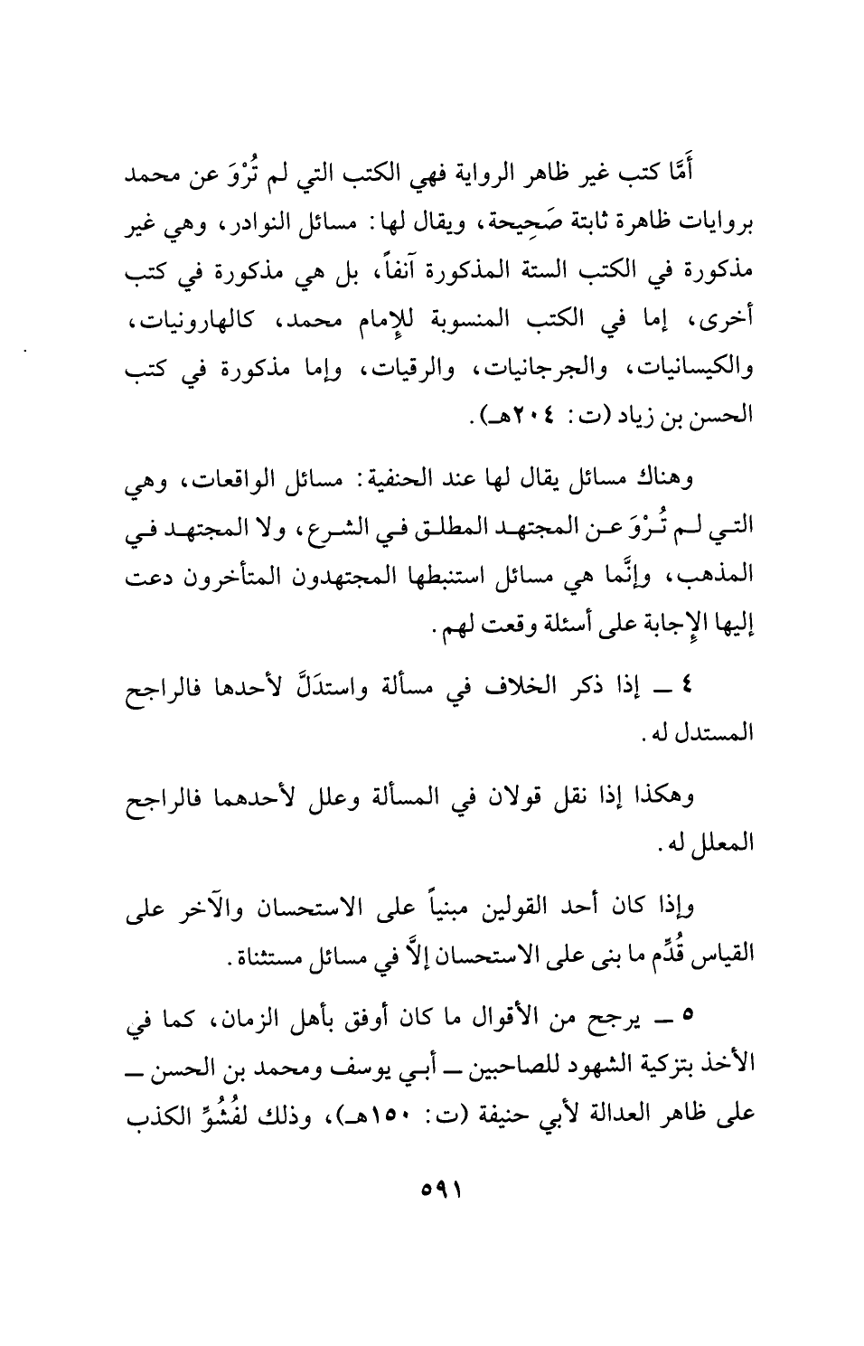 5 - يرجح من الأقوال ما كان أوفق بأهل الزمان، كما في الأخذ بتزكية الشهود للصاحبين - أبي يوسف ومحمد بن الحسن- على ظاهر العدالة لأبي حنيفة (ت: 150 هـ)، وذلك لفُشُوِّ الكذب