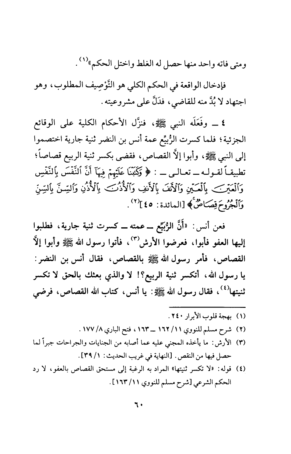 4 - وفَعَلَه النبي - صلى الله عليه وسلم -، فنزَّل الأحكام الكلية على الوقائع الجزئية؛ فلما كسرت الرُّبيِّع عمة أنس بن النضر ثنية جارية اختصموا إلى النبي - صلى الله عليه وسلم -، وأبوا إلَّا القصاص، فقضى بكسر ثنية الربيع قصاصًا؛ تطبيقًا لقوله- تعالى-: {وَكَتَبْنَا عَلَيْهِمْ فِيهَا أَنَّ النَّفْسَ بِالنَّفْسِ وَالْعَيْنَ بِالْعَيْنِ وَالْأَنْفَ بِالْأَنْفِ وَالْأُذُنَ بِالْأُذُنِ وَالسِّنَّ بِالسِّنِّ وَالْجُرُوحَ قِصَاصٌ} [المائدة: 45] (¬2).