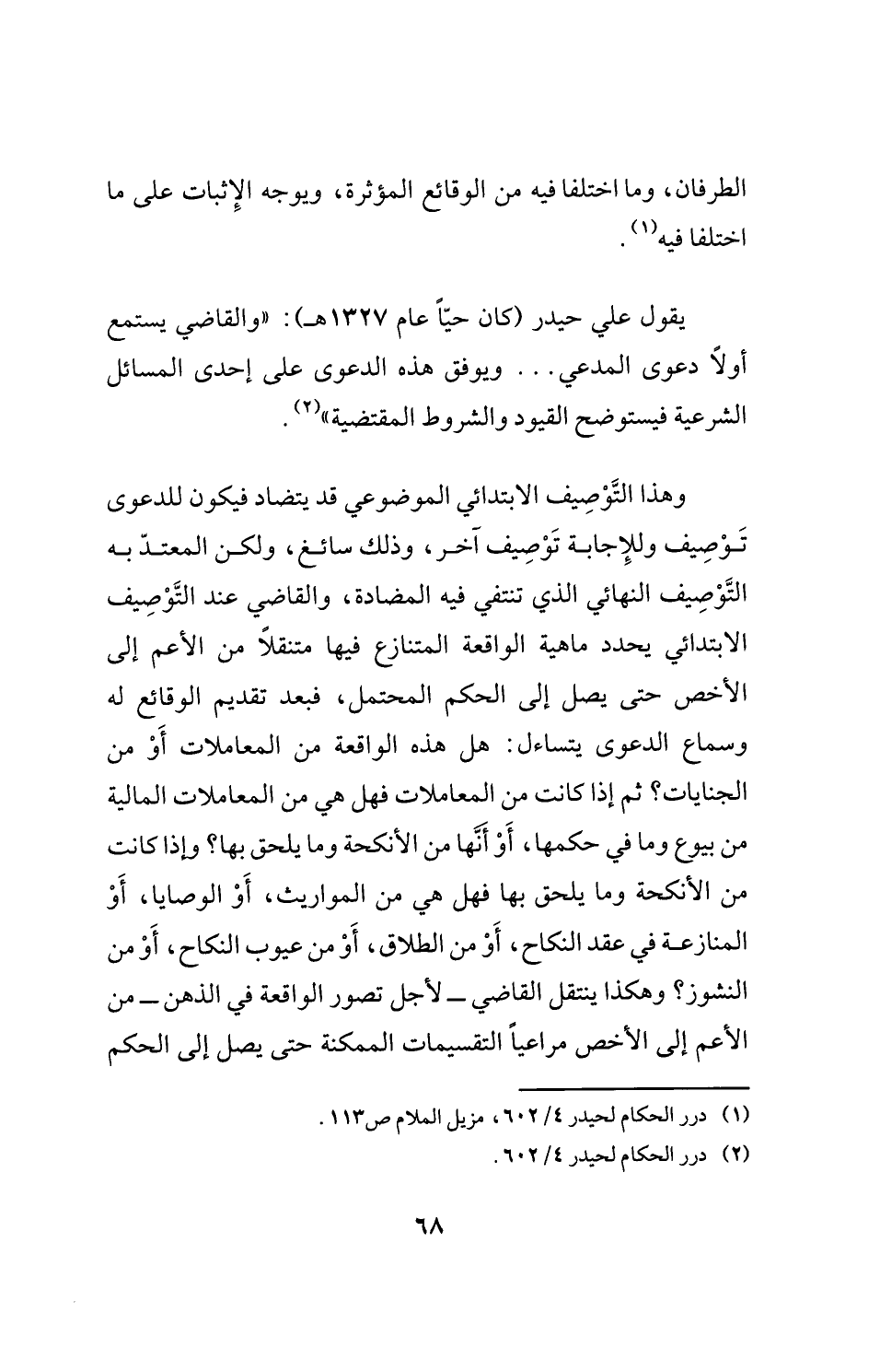 يقول علي حيدر (كان حيًّا عام 1327 هـ): "والقاضي يستمع أولًا دعوى المدعي ... ويوفق هذه الدعوى على إحدى المسائل الشرعية فيستوضح القيود والشروط المقتضية" (¬2).