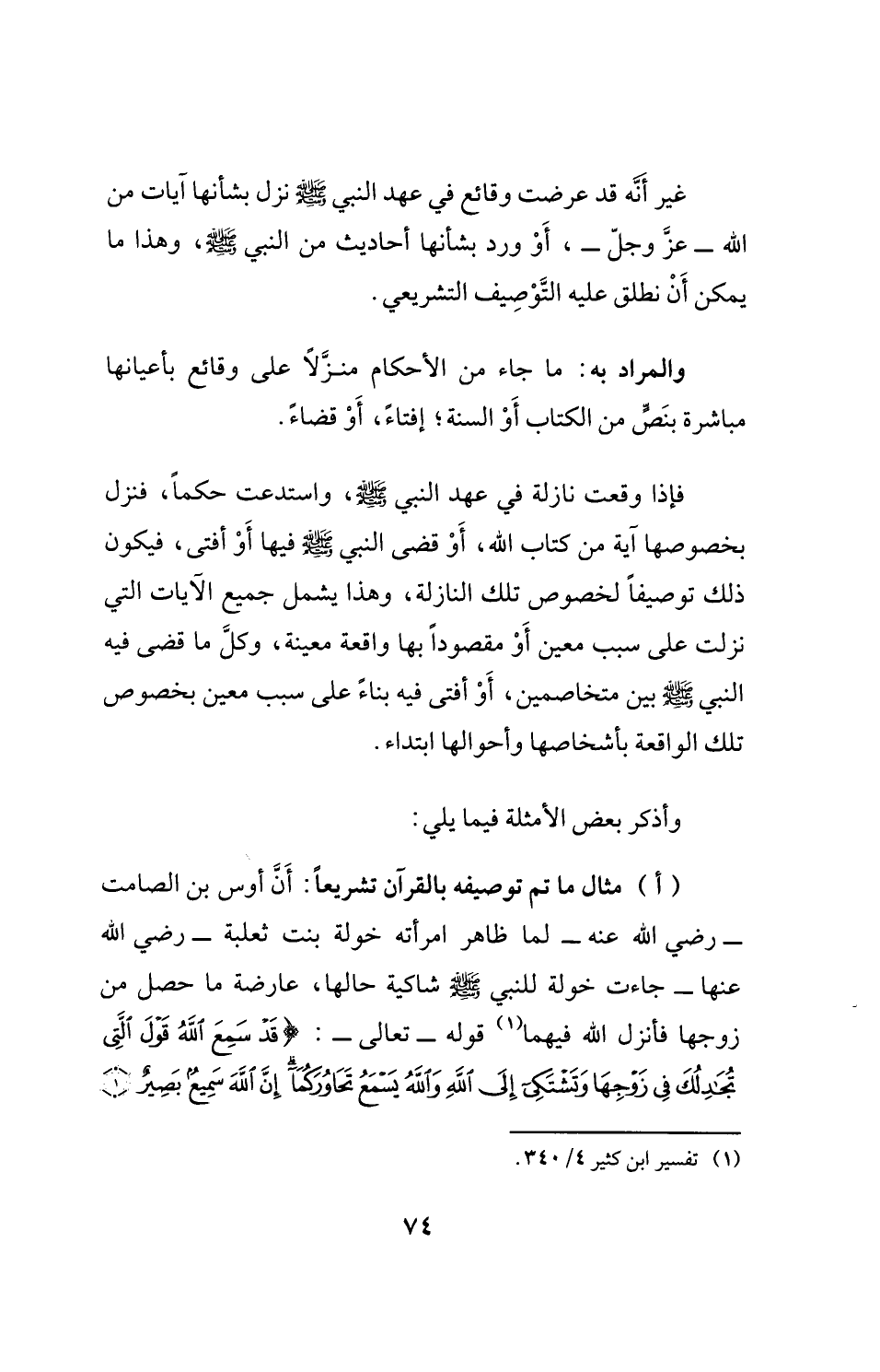 (أ) مثال ما تم توصيفه بالقرآن تشريعًا: أَنَّ أوس بن الصامت - رضي الله عنه- لما ظاهر امرأته خولة بنت ثعلبة- رضي الله عنها- جاءت خولة للنبي - صلى الله عليه وسلم - شاكية حالها، عارضة ما حصل من زوجها فأنزل الله فيهما (¬1) قوله- تعالى-: {قَدْ سَمِعَ اللَّهُ قَوْلَ الَّتِي تُجَادِلُكَ فِي زَوْجِهَا وَتَشْتَكِي إِلَى اللَّهِ وَاللَّهُ يَسْمَعُ تَحَاوُرَكُمَا إِنَّ اللَّهَ سَمِيعٌ بَصِيرٌ (1)