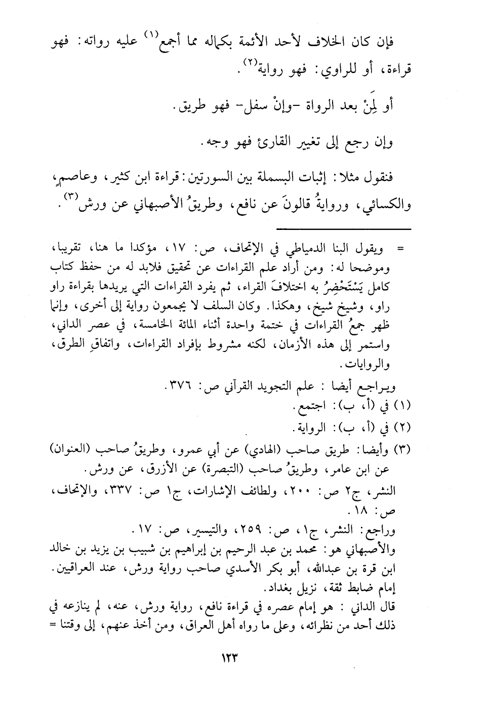 فَنَقُول مثلا: إِثْبَات الْبَسْمَلَة بَين السورتين: قِرَاءَة ابْن كثير، وَعَاصِم، وَالْكسَائِيّ، وَرِوَايَة قالون عَن نَافِع، وَطَرِيق الْأَصْبَهَانِيّ عَن ورش.