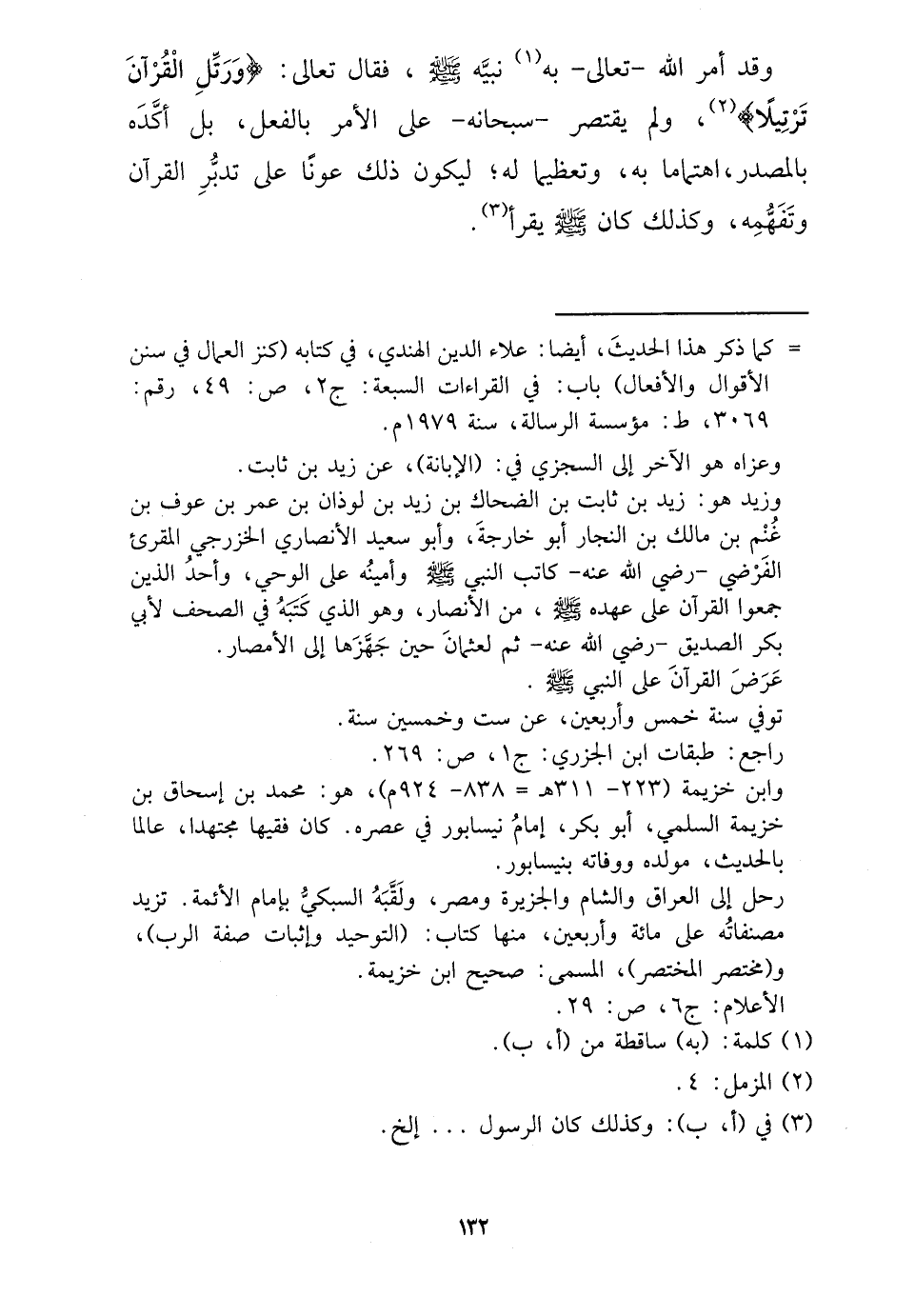 وَقد أَمر الله - تَعَالَى - بِهِ نبيه - صَلَّى اللَّهُ عَلَيْهِ وَسَلَّم َ -، فَقَالَ تَعَالَى: {ورتل الْقُرْآن ترتيلاً} ، وَلم يقْتَصر - سُبْحَانَهُ - على الْأَمر بِالْفِعْلِ، بل أكده بِالْمَصْدَرِ، اهتماماً بِهِ، وتعظيماً لَهُ؛ ليَكُون ذَلِك عوناً على تدبر الْقُرْآن وتفهمه، وَكَذَلِكَ كَانَ - صَلَّى اللَّهُ عَلَيْهِ وَسَلَّم َ - يقْرَأ.