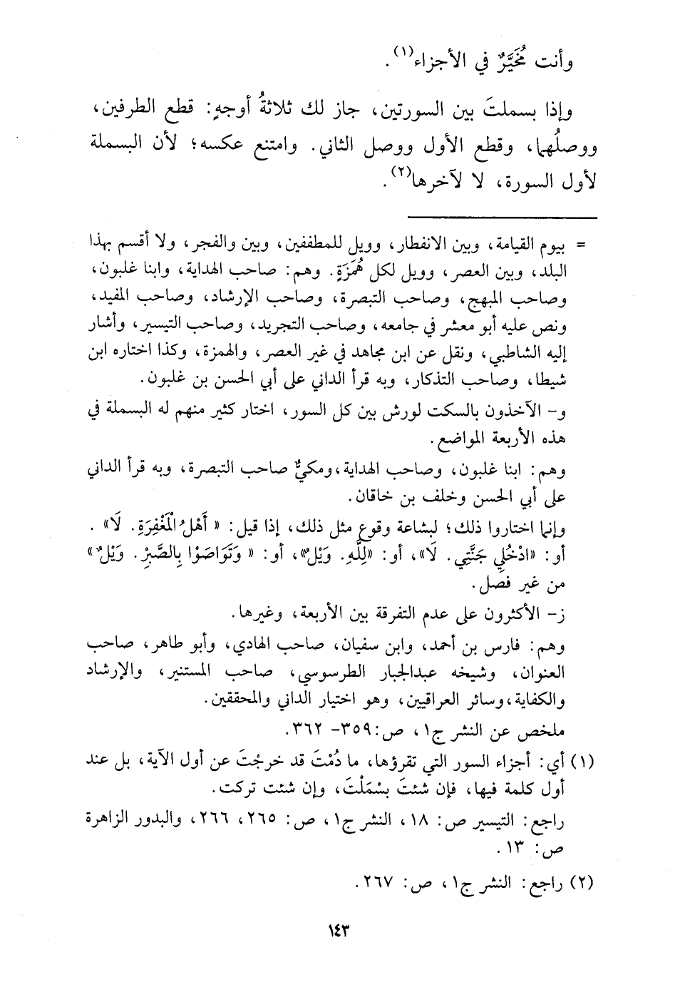 وَإِذا بسملت بَين السورتين، جَازَ لَك ثَلَاثَة أوجه: قطع الطرفينى، ووصلهما، وَقطع الأول وَوصل الثَّانِي. وَامْتنع عَكسه؛ لِأَن الْبَسْمَلَة لأوّل السُّورَة، لَا لآخرها.