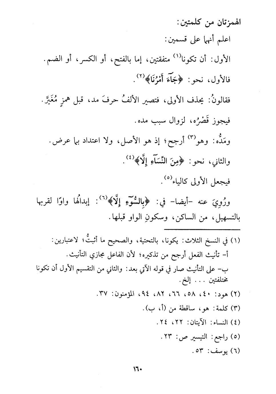 اعْلَم أَنَّهُمَا على قسمَيْنِ: الأول: أَن تَكُونَا متفقتين، إِمَّا بِالْفَتْح، أَو الْكسر، أَو الضَّم. فَالْأول، نَحْو: {جَاءَ أمرنَا} .