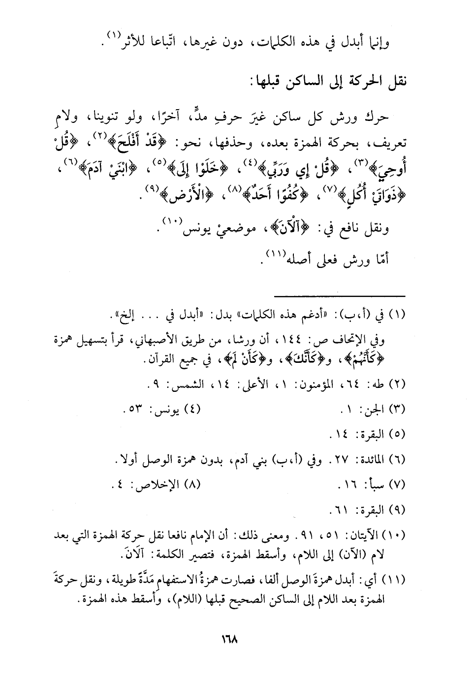 حرك ورش كل سَاكن غير حرف مد، آخرا، وَلَو تنوينا، وَلَام تَعْرِيف، بحركة الْهمزَة بعده، وحذفها، نَحْو: {قد أَفْلح} ، {قل أُوحِي} ، {قل إِي وربي} ، {خلوا إِلَى} ، {ابْني آدم} ، {ذواتي أكل} ، {كفوا أحد} ، {الأَرْض} .