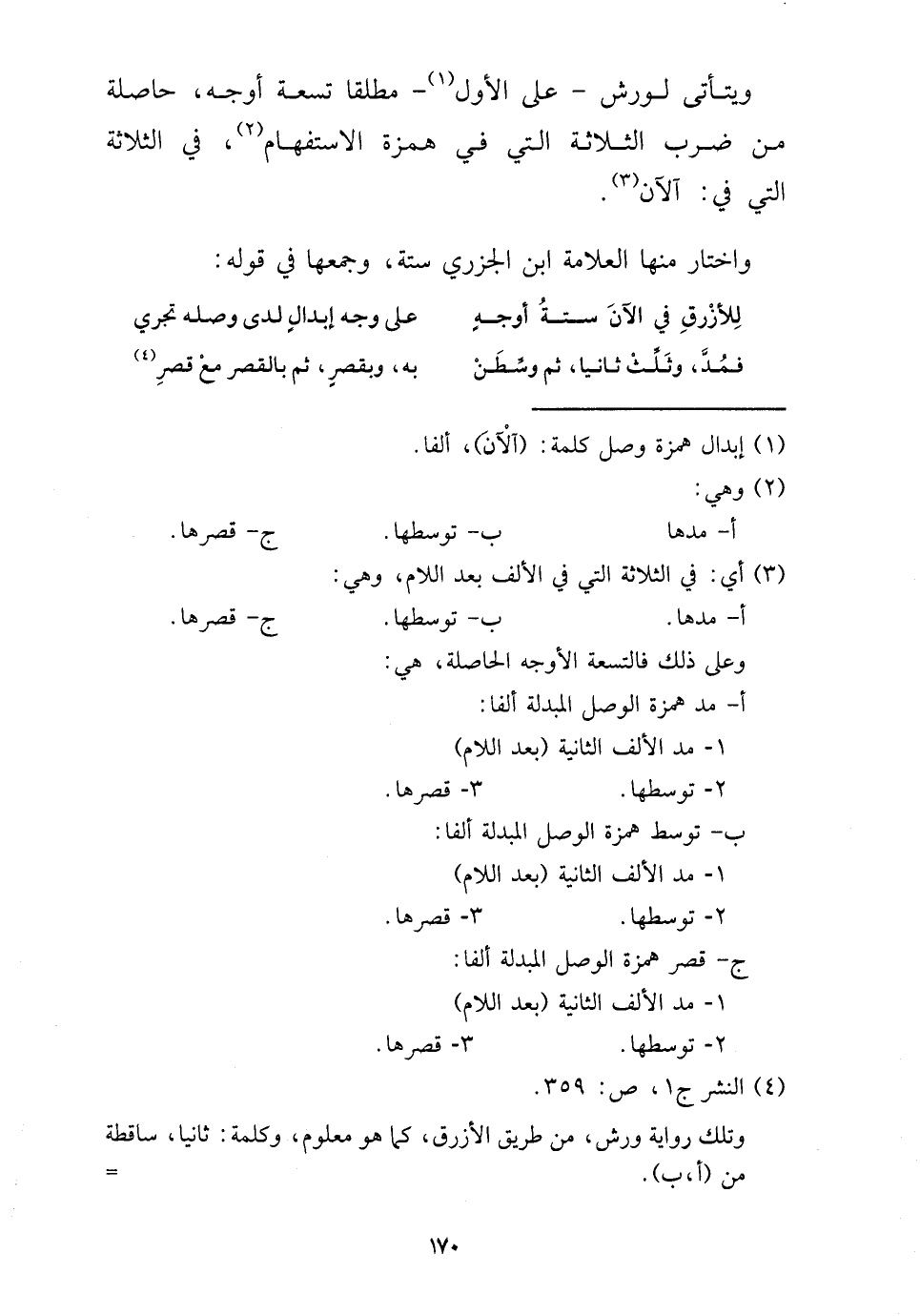 ويتأتى لورش - على الأول - مُطلقًا تِسْعَة أوجه، حَاصِلَة من ضرب الثَّلَاثَة الَّتِي فِي همزَة الِاسْتِفْهَام، فِي الثَّلَاثَة الَّتِي فِي: آلآن.
