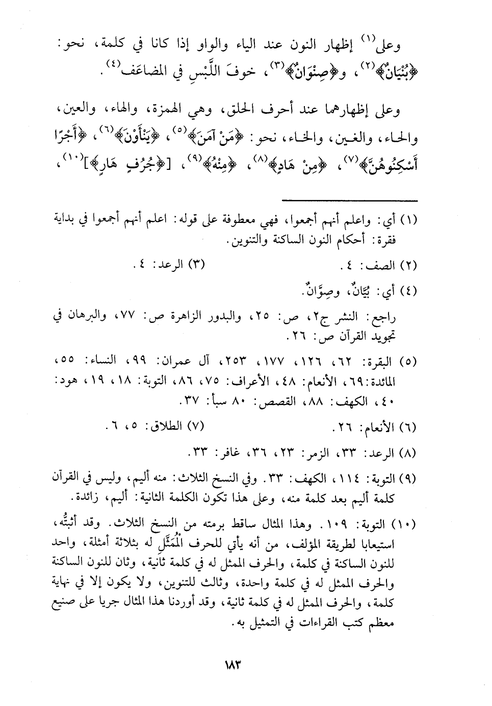 وعَلى إِظْهَار النُّون عِنْد الْيَاء وَالْوَاو إِذا كَانَا فِي كلمة، نَحْو: {بُنيان} ، و {صنْوَان} ، خوف اللّبْس فِي المضاعف.